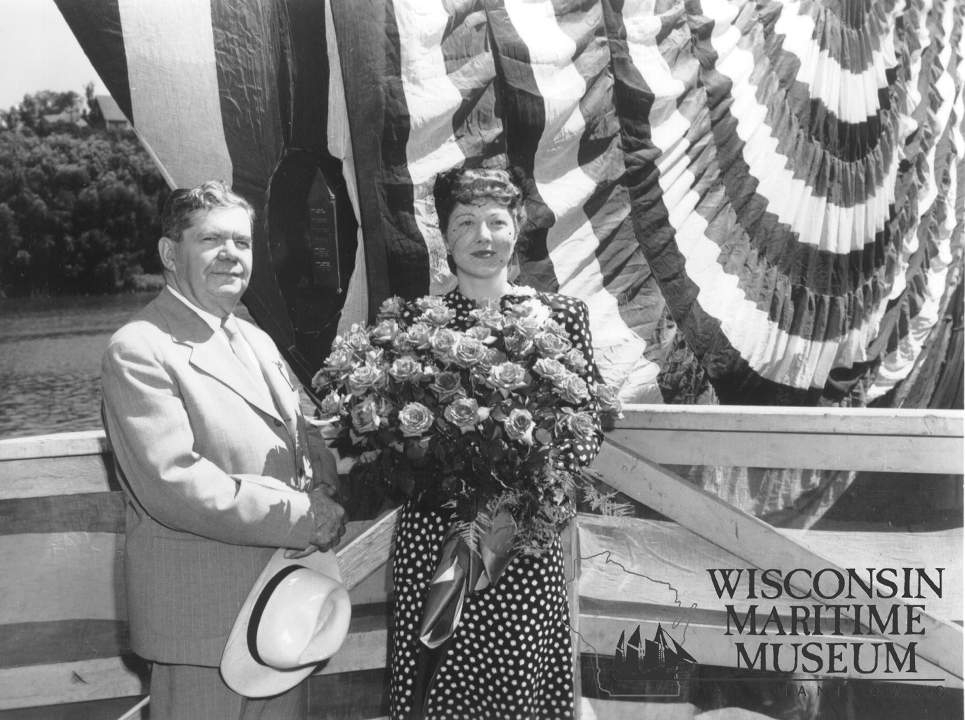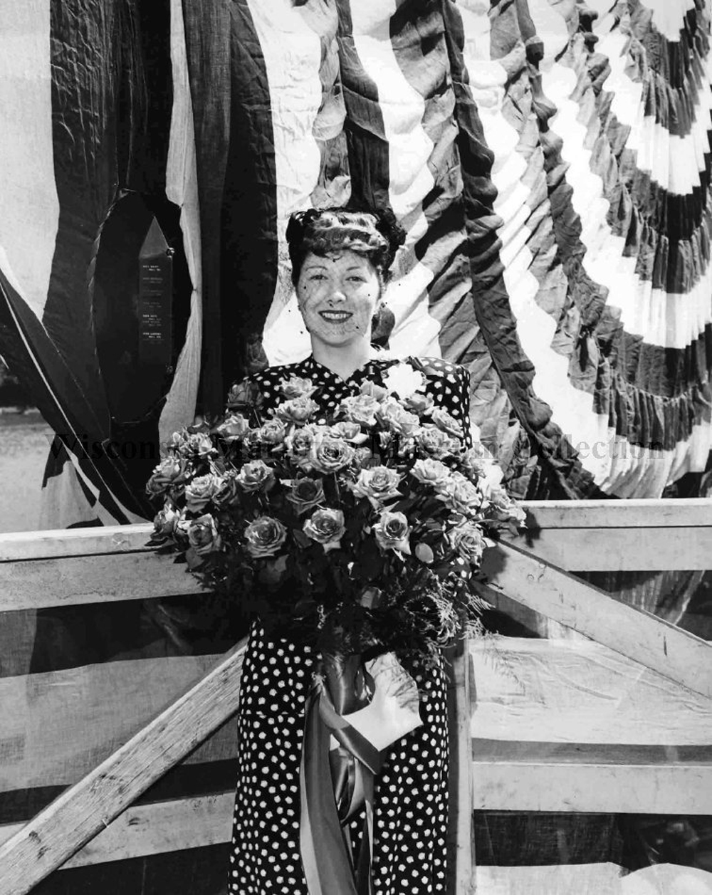 ![]() 0837410 | 660k | Close up of Mrs. Barbara Fox, sponsor of the Manitowoc built submarine Loggerhead (SS-374), alone with roses on launch platform at Manitowoc Shipbuilding Company on 13 August 1944. | Photo by Harry Berns, Official photographer of the Manitowoc Shipbuilding Co., Manitowoc, WI. This photo # P-97817, can be ordered from the Wisconsin Maritime Museum. |