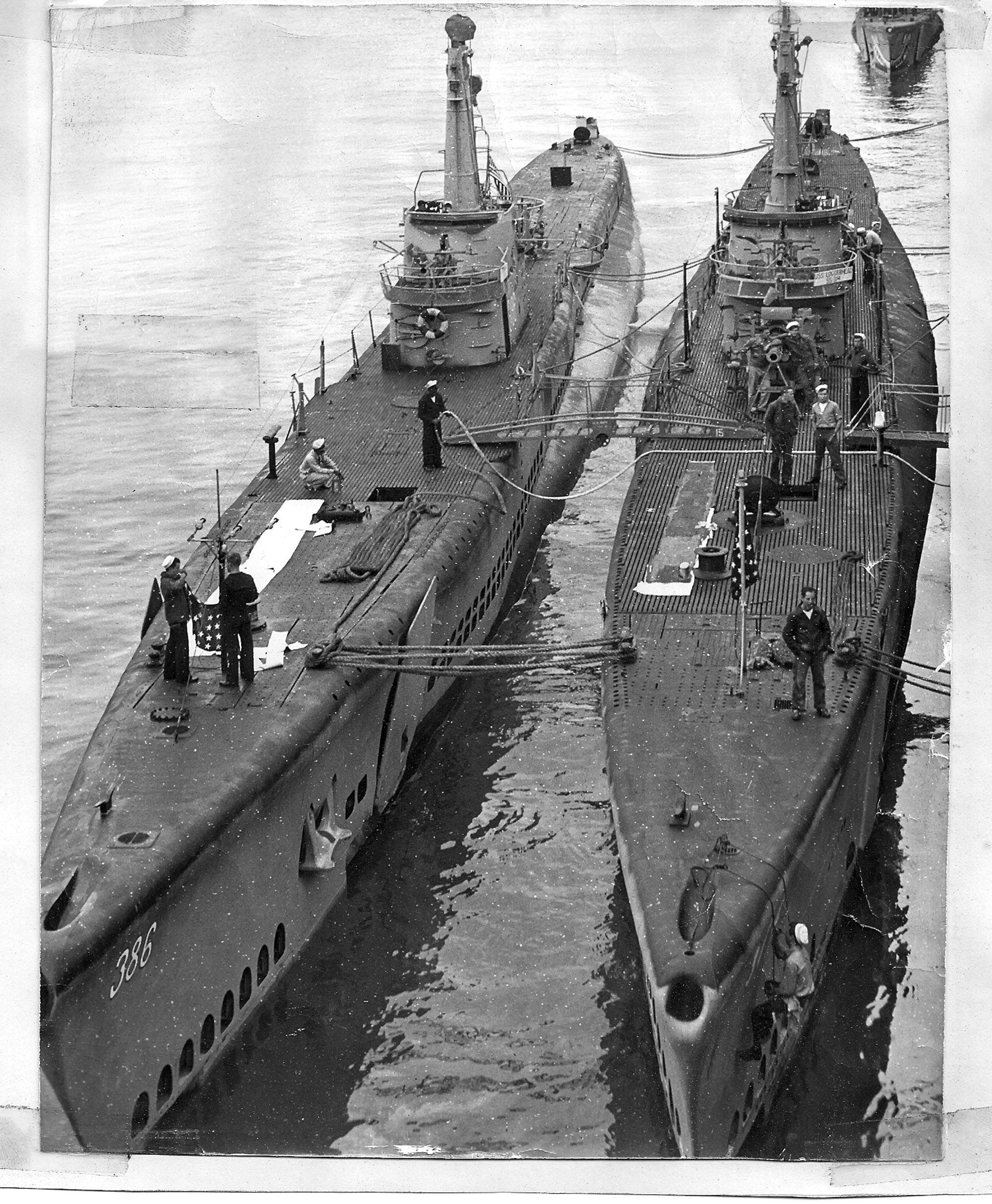 700k | Pilotfish (SS-386) & Loggerhead (SS-374) with crewmen at quarters, September 1945. Probably taken upon her arrival at San Francisco, California, on 21 September. | Photograph courtesy of Angelo L. Lombardi via his daughter Mariann. | |