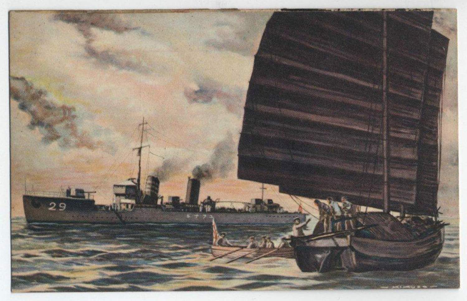 901k | Japanese captions: "Our Destroyer capturing enemy War-Junk", Artwork by Kikuzo Ito On 19–20 June Yunagi escorted Admiral Jisaburo Ozawa’s 1st Supply Force at the Battle of the Philippine Sea. Afterwards, she was assigned to escort tanker convoys via Manila to Kure. On 18 1944 July Yunagi was reassigned directly to the Combined Fleet. From 10–18 August 1944, she escorted a convoy from Moji via Mako towards Manila, but detached to Takao to assist the damaged transport Eiyo Maru. On her return from Takao to Manila, she was torpedoed and sunk 20 miles (32 km) north-northeast of Cape Bojeador, Luzon by the Picuda (SS-382). |