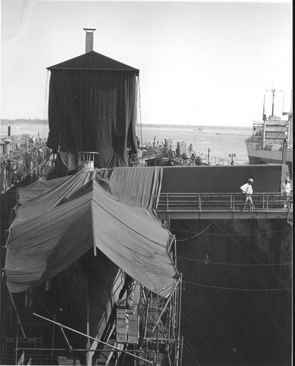 416k | Printing on side states, "MAY 61". Included note states, Two Experiments ---The installation of a ventilation system, indicated by the "chimneys", permitted 500 man shifts of work to be accomplished on the submarine Picuda (SS-382) during the sandblasting and painting period. Previously no other work was performed during this period. Incident to the ventilation system is the enclosed air-lock accessed (right). The complete canvas all-weather cover permitted sandblasting and painting to continue without interference from rain, dew, and fog. Work that normally requires ten to twelve days was completed in seven." | Photo courtesy of Lowcountry Digital Library | |
