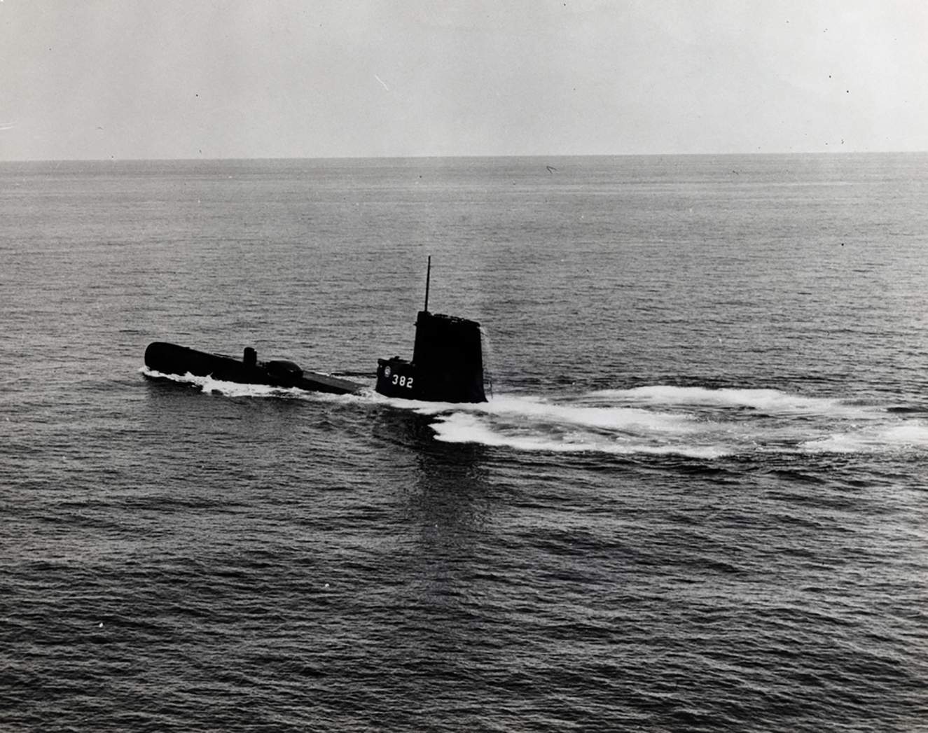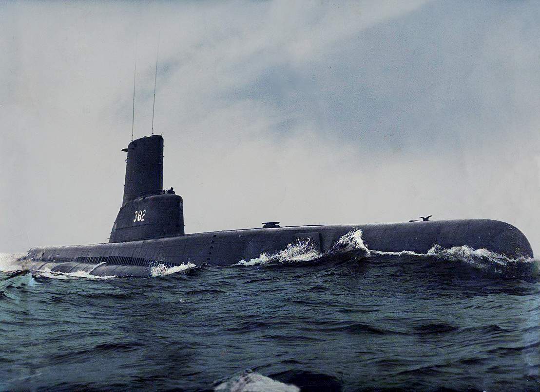 389k | Port side view of the Picuda (SS-382), after refit and conversion at Portsmouth Naval Shipyard NH, somewhere in the Atlantic, 23 February 1954. | USN photo # USN 636381 courtesy of ussubvetsofwwii.org. | |