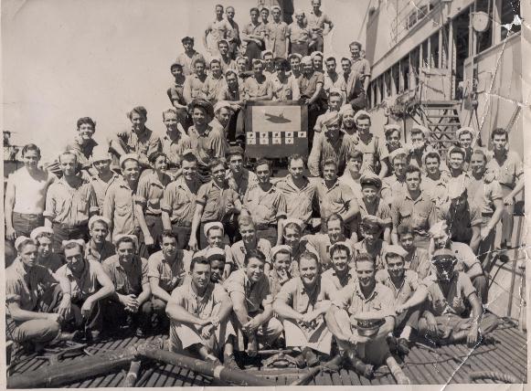 103k | Photo of the crew of the Picuda (SS-382) believed to have been taken by a subtender off Saipan in 1944. My father, the late E. L. Edwards, Jr., is depicted on the left without a shirt. He was a Motor Machinist's Mate 3d class. | Courtesy of Lee Edwards. | |
