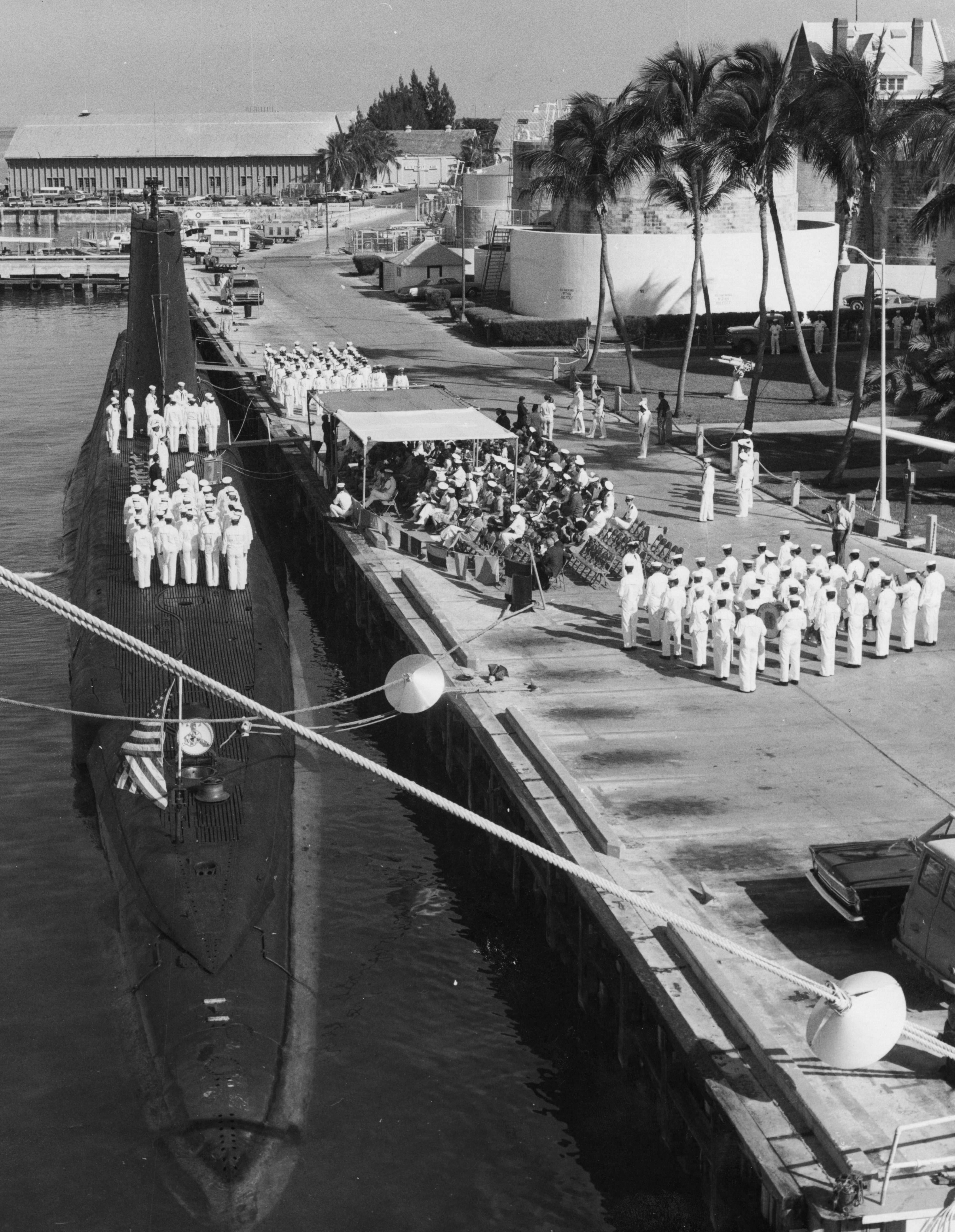 2.10k | The crew of the Picuda (SS-382) line her deck durinng her transfer ceremony to Spain on 1 October 1972. | Photo from the Ida Woodward Barron Collection from Flickr.com via Stephen Gower. | |