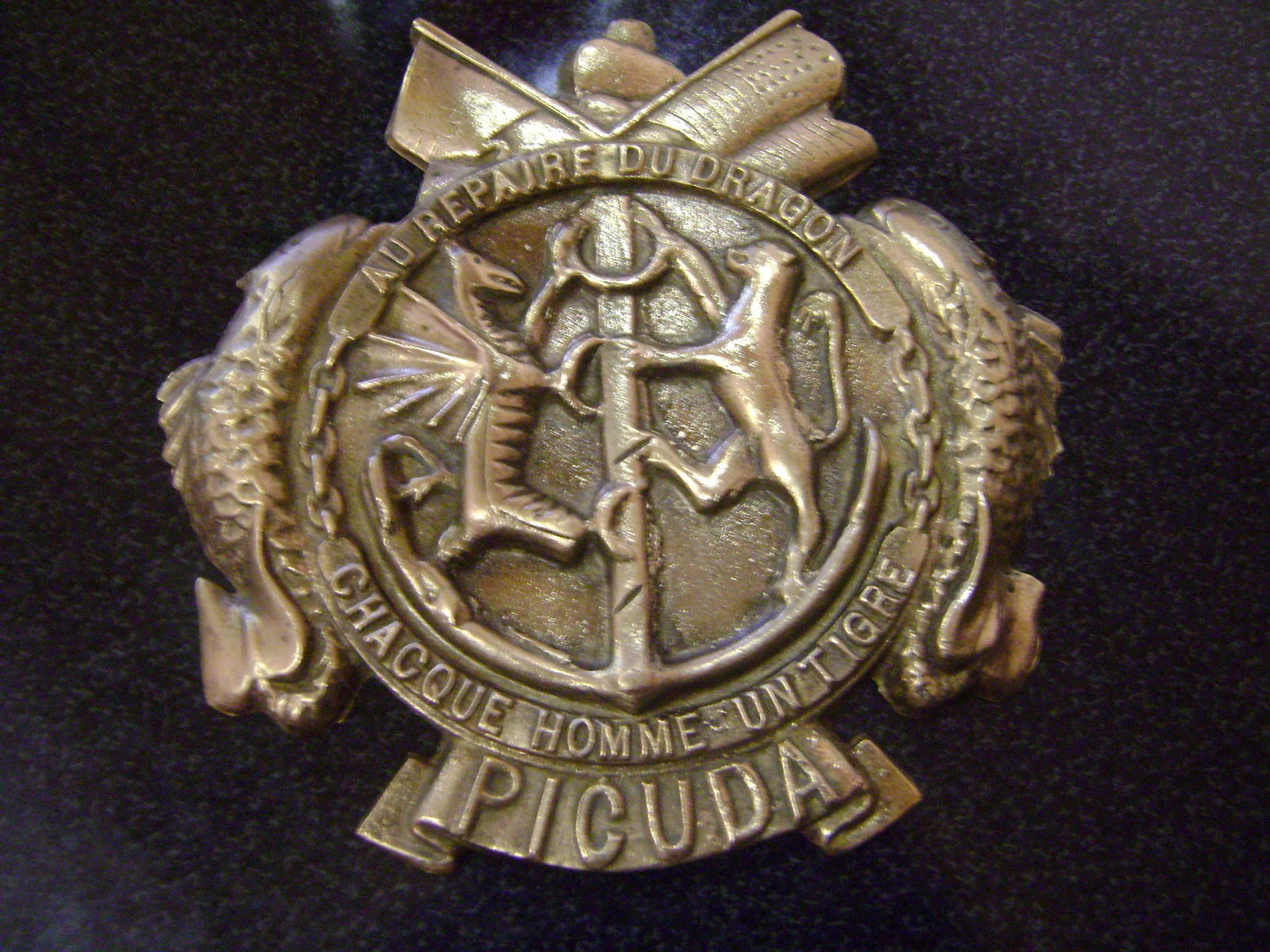 109k | ex-Picuda's (SS-382) plaque. The translation is from the French language: "Au repaire du dragon, cha(c)que homme un tigre": "In the dragon's lair, every man is a tiger". | Photo i.d. courtesy of David Johnston (USN, retired) Ric Hedman & John Hummel, USN (Retired). Photo courtesy of Sergio Cocciarin & translation courtesy of Yves Hubert. |