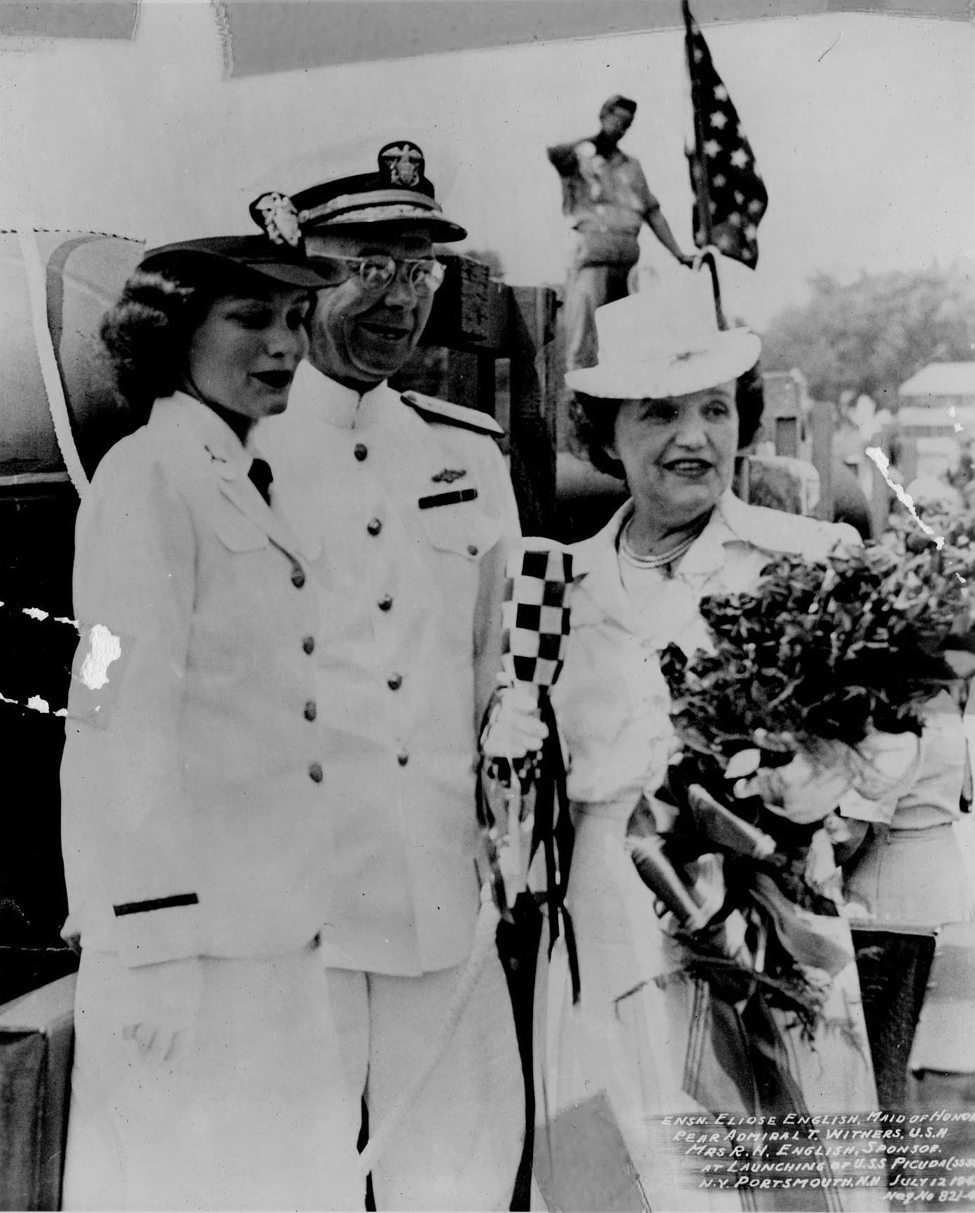 ![]() | 1.07k | Ensn. Eloise English, maid of honor, Rear Admiral T. Withers U.S.N., Mrs. R.N. English, sponsor, at launching of Picuda (SS-382), Navy Yard, Portsmouth, N.H., 12 July 1943. | National Archives Identifier: 12562968 Photo courtesy of catalog.archives.gov |