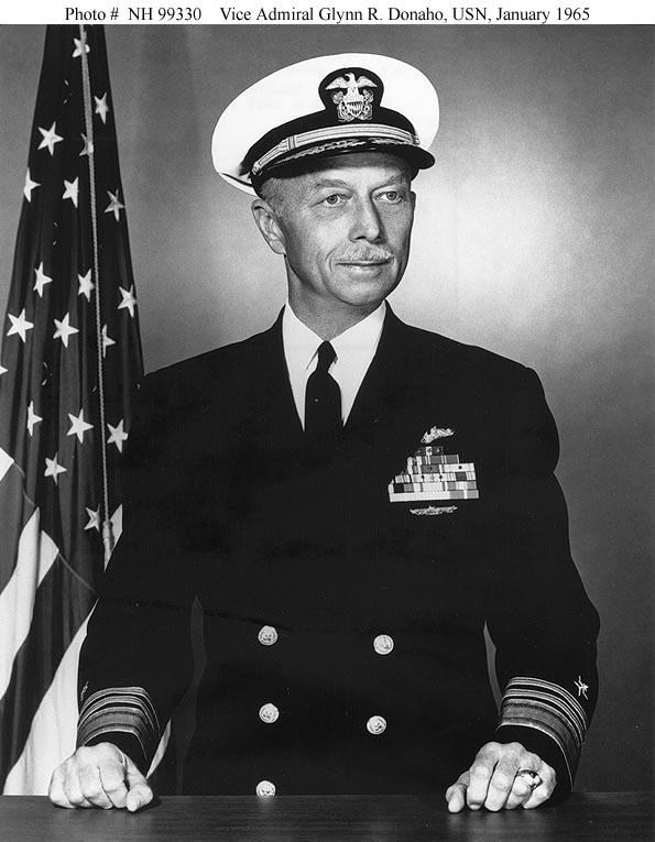 75k | In 1940 and 1941 Lt. Glynn R. Donaho was Commanding Officer of the submarine R-4 (SS-81). When the United States entered World War II on 7 December 1941, Lieutenant Donaho was Prospective Commanding Officer of the new submarine Flying Fish (SS-229), which he placed in commission a few days later and operated with distinction during six war patrols in the Pacific. He was promoted to Lieutenant Commander at the beginning of 1942 and to Commander in September of that year. During 1944 and several months of 1945 he commanded both a submarine division and the submarine Picuda (SS-382), conducting further notably successful combat operations against Japanese shipping. Donaho finished the Pacific War as a battleship force staff officer. He is pictured here as a Vice Admiral. |