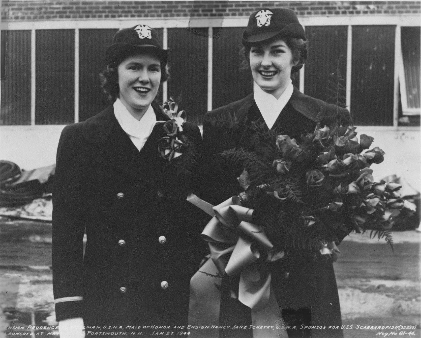 273k | Ensign Prudence H. Wellman, U.S.N.R., maid of honor, and Ensign Nancy Jane Schetky, U.S.N.R., sponsor for Scabbardfish (SS-397). Launched at Navy Yard, Portsmouth, N.H. on 27 January 1944. She lies now at Arlington. |
