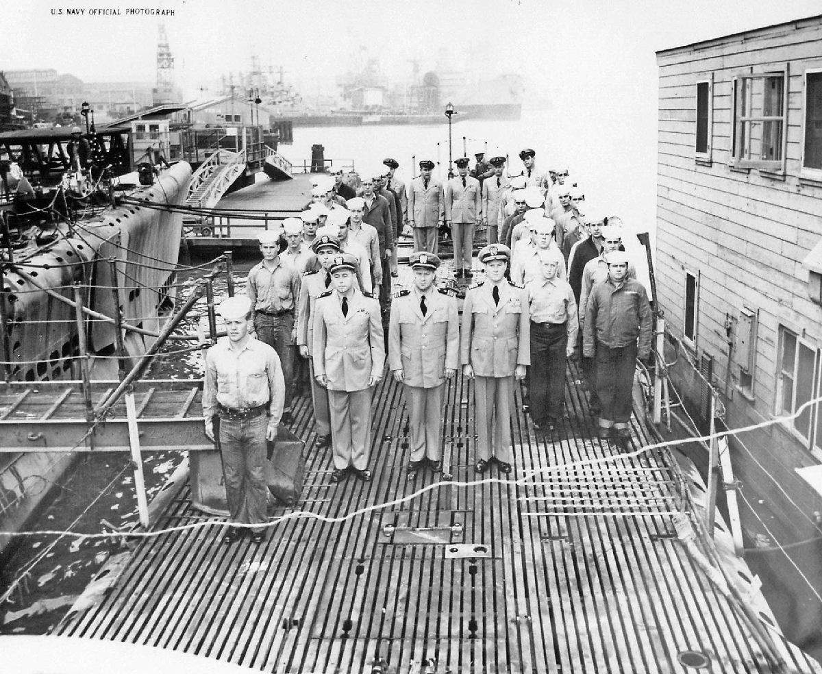 924k | Interesting collection of offficers gathered for the re-commissioning of Lionfish (SS-298) & Scabbardfish (SS-397) at Mare Island on 31 January 1951. Officers are from left to right. Capt. Willis A. Lent – Commander, Mare Island Group, Pacific Reserve Fleet. He wears two Navy Cross Stars (1) Commanding Officer, Grenadier (SS 210) & (2) Commanding Officer, Triton (SS-201) during WWII. LCDR Richard M. Wright – Commanding Officer of Scabbardfish (SS-397). He wears the Silver Star for actions as Asst. Approach Officer of Spadefish (SS 411) WWII and Navy & Marine Corps Medal for his action aboard Cochino (SS 345) in 1948 sinking. RADM Thomas R. Cooley – Deputy Commander, Pacific Reserve Fleet. He wears the Legion of Merit for his action as Commanding Officer, Washington (BB- 56) during WWII. LCDR Arthur G. McIntyre – Commanding Officer, Lionfish. He wears the Prisoner of War Medal for 22 months as a Japanese prisoner in WWII after sinking of Grenadier. He also wears a Purple Heart. |