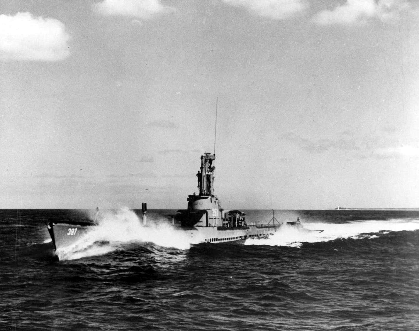 ![]() | 162k | Portside view of the Scabbardfish (SS-397) underway, and throwing a wash over her bow, circa 1944-45. | Courtesy of ussubvetsofworldwarii.org. | |