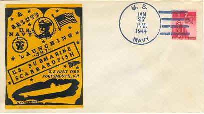 ![]() | 15k | Commemorative postal cover marking Scabbardfish's (SS-397) launching, 27 January 1944. | Courtesy of Jack Treutle (of blessed memory). | |