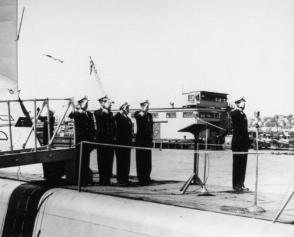 117k | LCDR R. H. Gumon assumes command of the Stickleback (SS-415) at her re-commissioning at Mare Island on 26 June 1953 following her Guppy IIA conversion. Officers in the background are (left to right): RADM L. S. Fiske (Mare Island Area Commander), RADM A. M. Morgan (shipyard Commander), Capt. E. S. Carmick (Director of Maintenance MSTS - Speaker) and Capt. W. T. Singer (Administrative Officer). | USN photo # 17911-6-53, courtesy of Darryl L. Baker. | |
