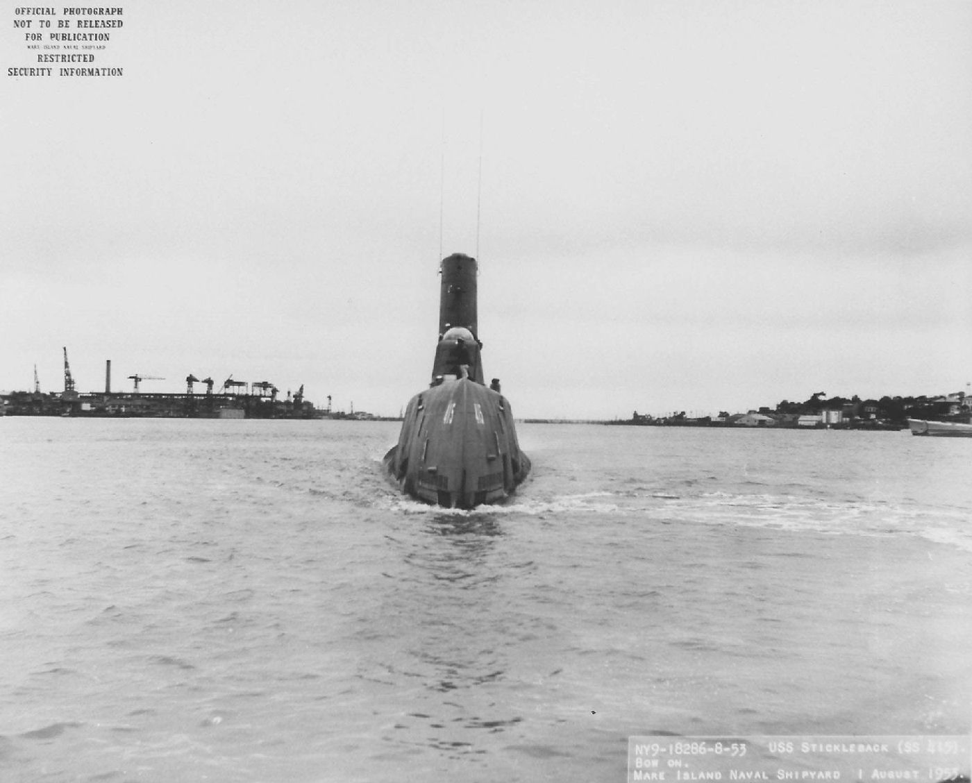 123k | Bow on view of Stickleback (SS-415) departing Mare Island on 1 August 1953. | USN photo # 18286-8-53, courtesy of Darryl L. Baker. | |