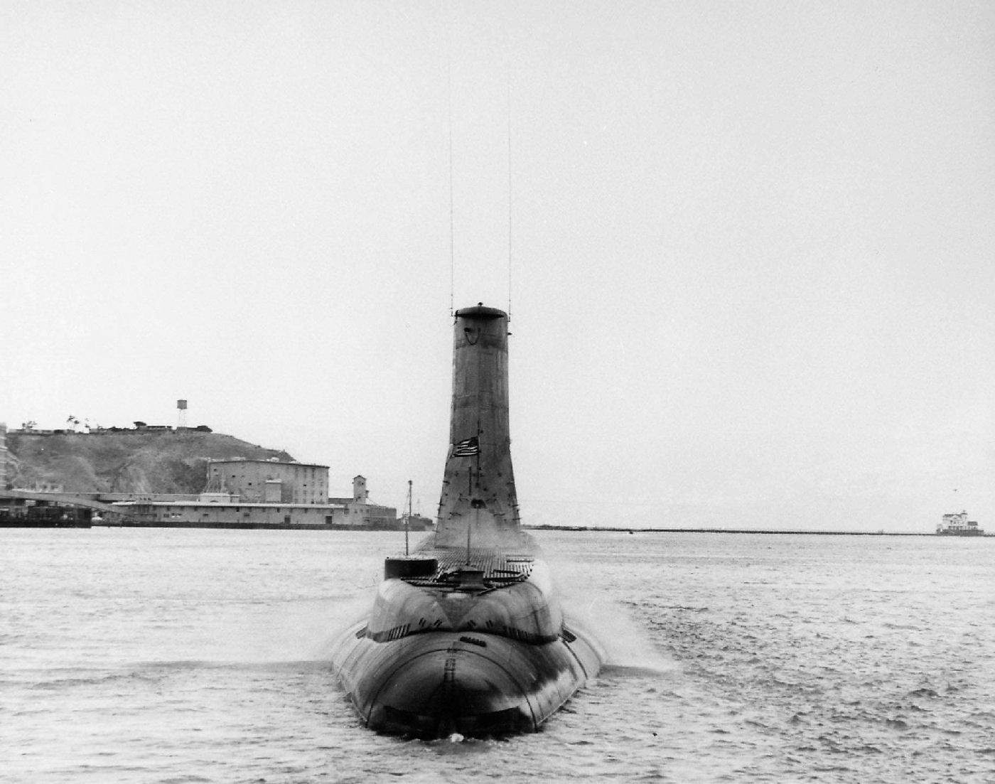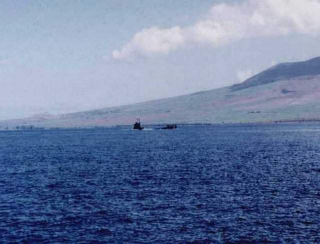 34k | Stickleback (SS-415), (as seen from the Caiman (SS-323),while conducting torpedo tests) was specially outfitted to be a torpedo target for testing sonic torpedoes. The outer hull had been reinforced with 1" thick steel (the normal outer tank shell was only 1/4" thick). We conducted operations with the Stickleback off Lahaina to test the homing capabilities of the new electric sonic guided torpedoes. We actually shot unarmed torpedoes at her with the expectation they would impact her hull near the screws. Here she is seen surfacing off the west coast of Maui after serving as target for our torpedoes. We fired the torpedoes while on the surface in order to monitor the torpedo track. We had observers standing on the stern and fired out of the stern tubes. Circa 1953. | Courtesy of Grant Riddle's submarinebaseph.com | |