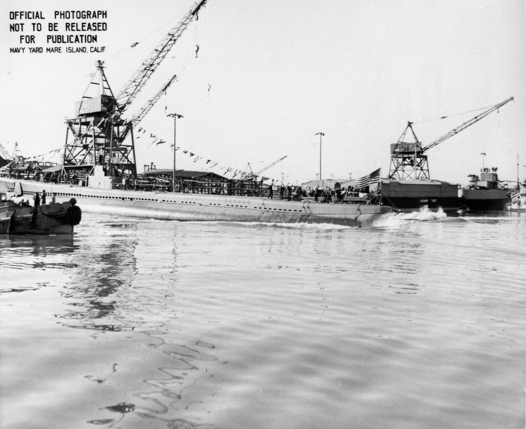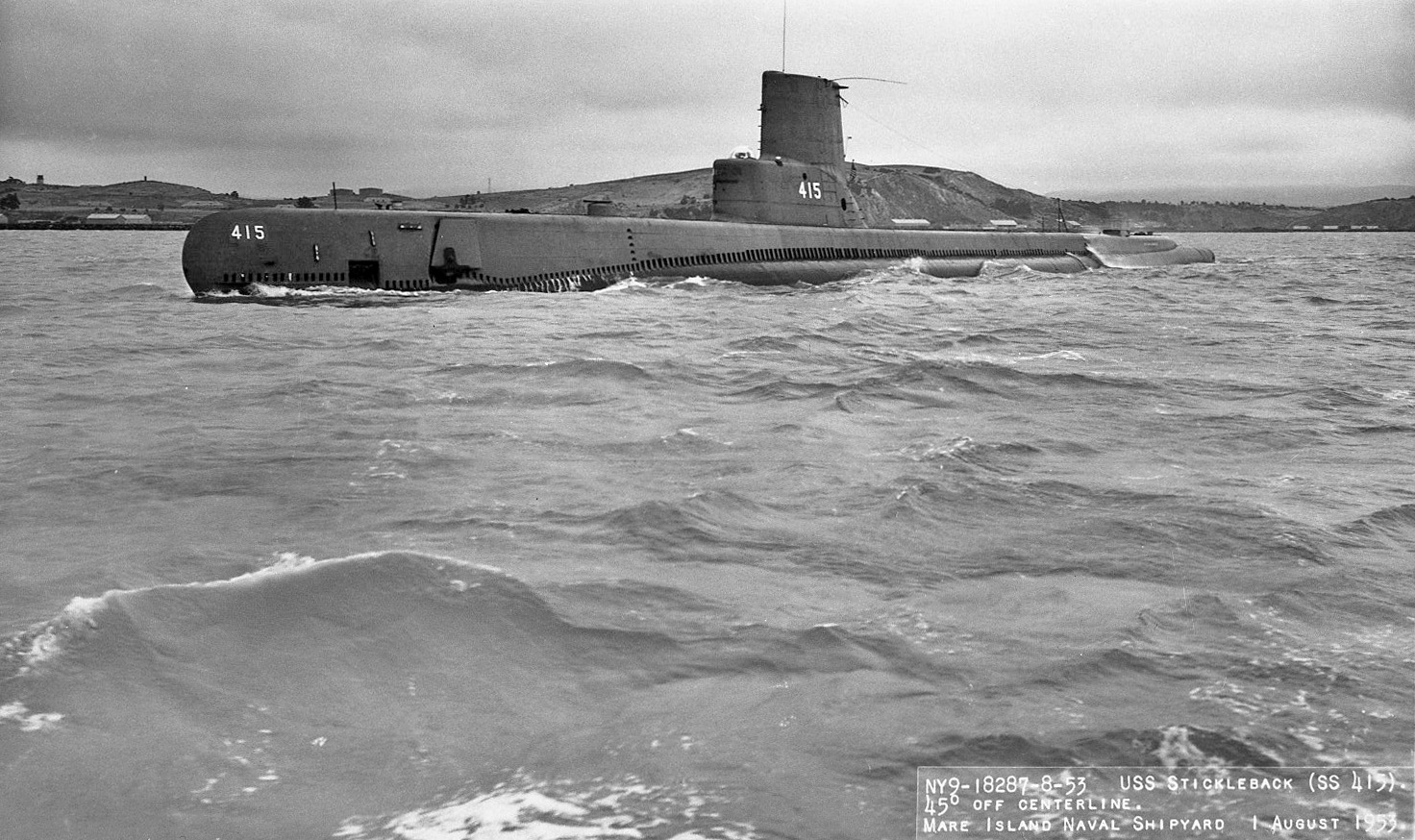 141k | Stern view of Stickleback (SS-415) departing Mare Island on 1 August 1953. | USN photo # 18290-8-53, courtesy of Darryl L. Baker. | |