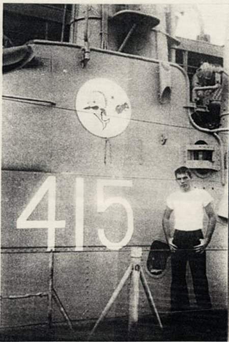 43k | A Stickleback poses on the Stickleback's (SS-415) conning tower, circa end 1945. | Photo courtesy of H. F. Carlson, submitted by Gary Carlson. | |
