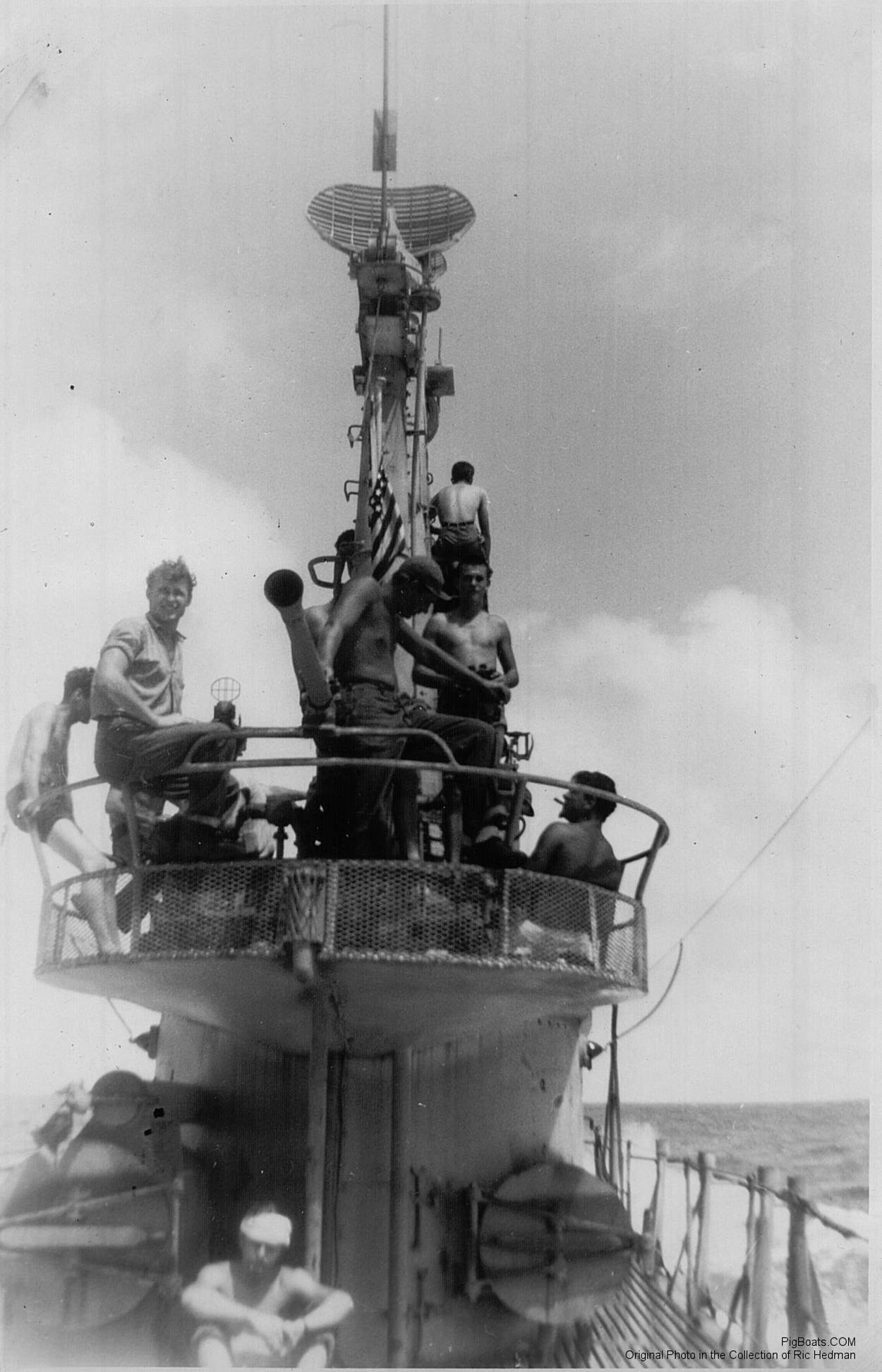 197k | Stickleback (SS-415) was only on station for two days on her first war patrol in the Sea of Japan when WW II ended. She had been crewed almost in entirety by the former crew of the Salmon (SS-182) upon commissioning. I'm sure that was a disappointed pre-comm crew. This photo was taken in the Sea of Japan in August 1945. The war ended on 15 August. Photo probably about the 19th or 20th of August. | Photo from the personal collection of Ric Hedman. | |
