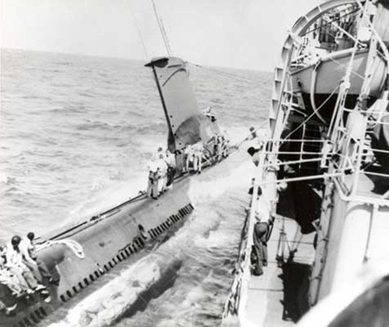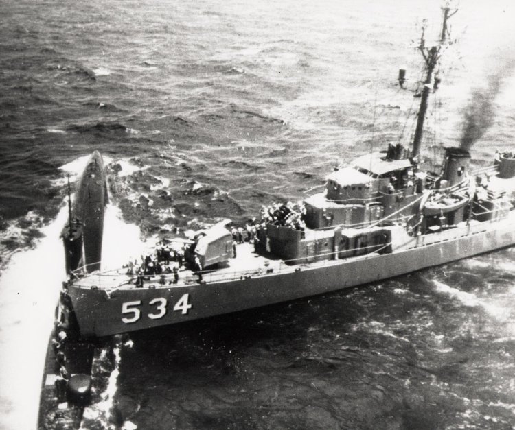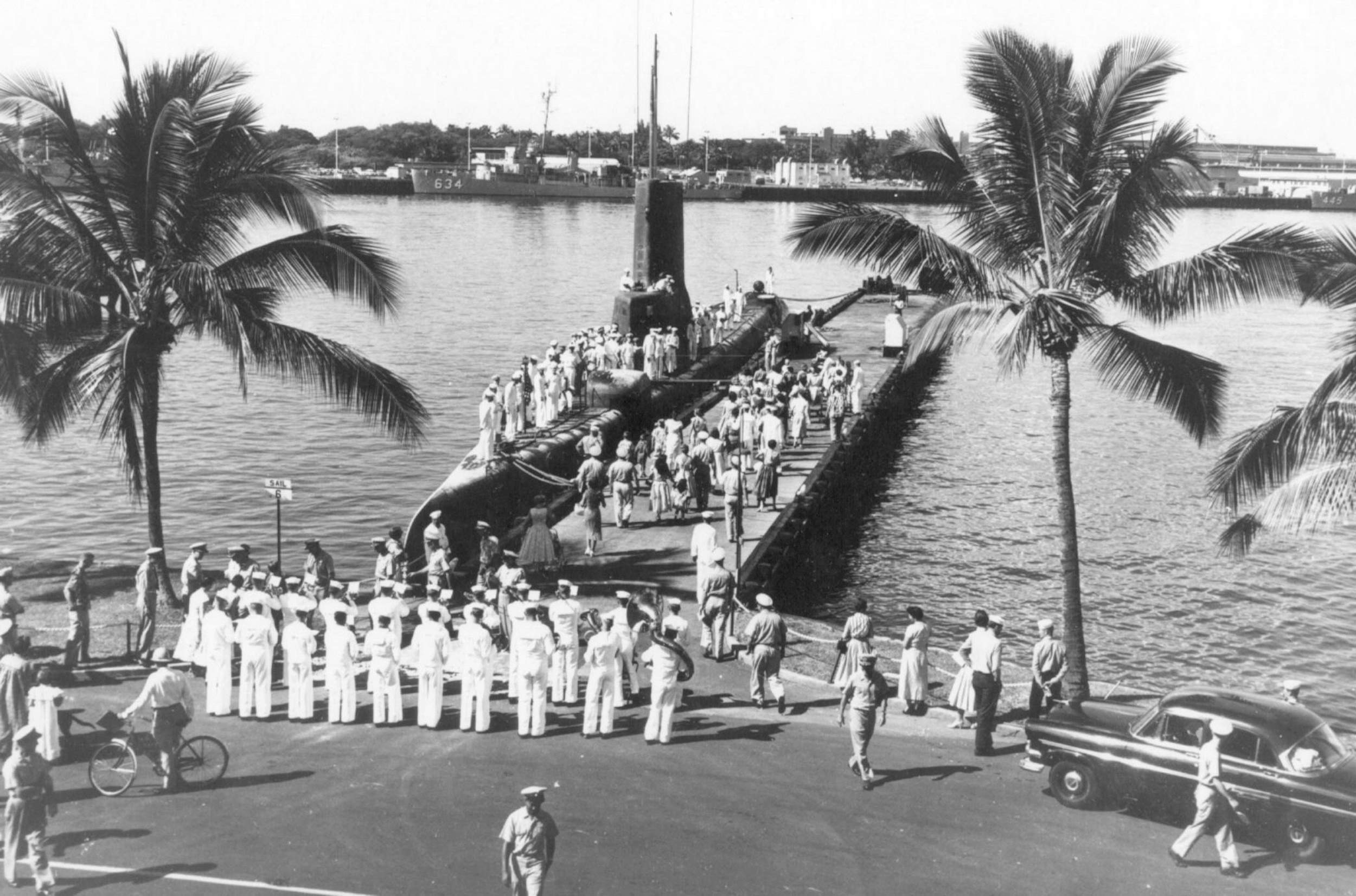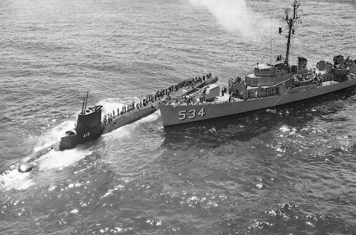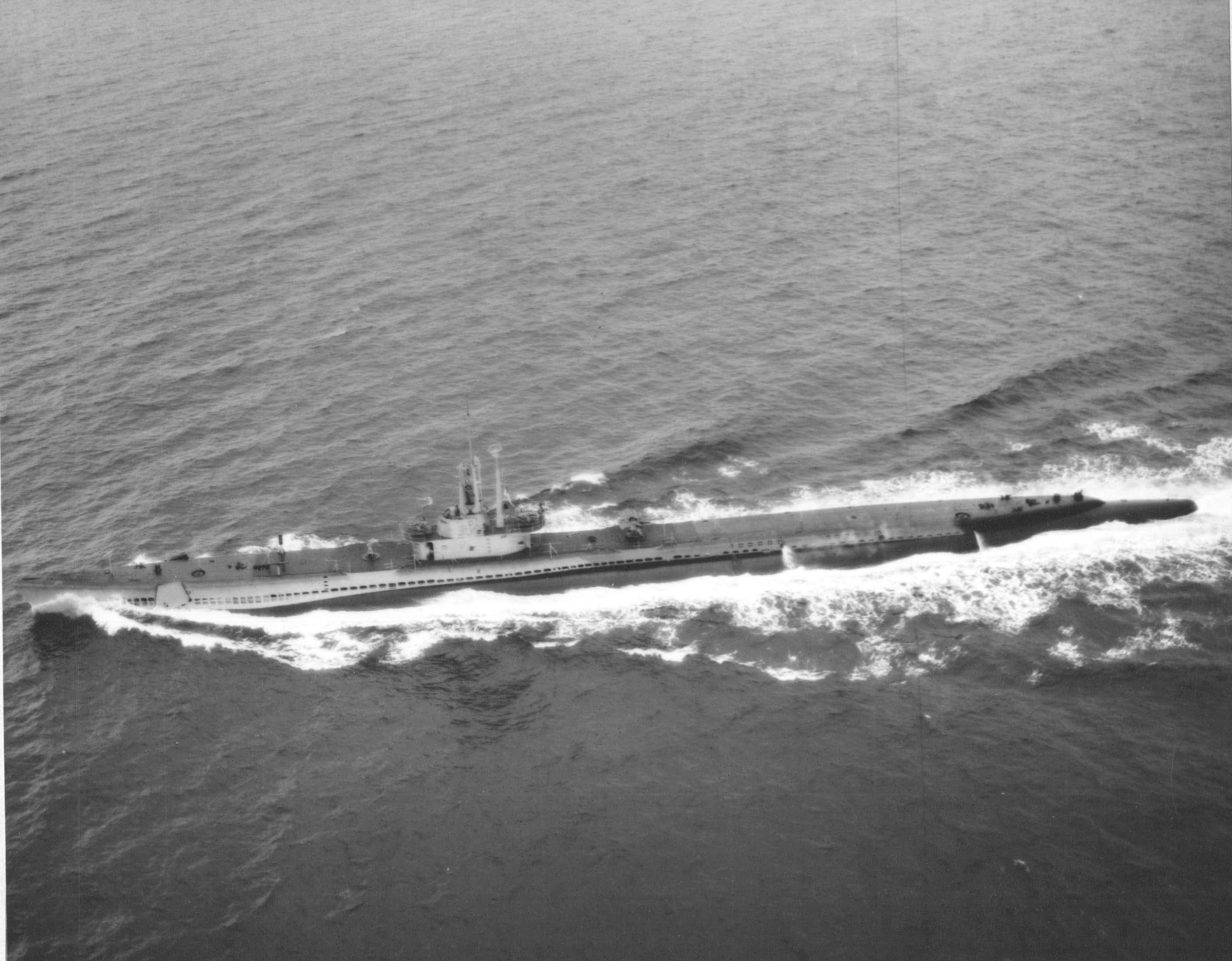 700k | The Sabalo (SS-302) comes to the aid of the Stickleback (SS-415), after being rammed by Silverstein (DE-534) off Honolulu, HI, 30 May 1958. | Courtesy of John Hummel, USN (Retired). | |