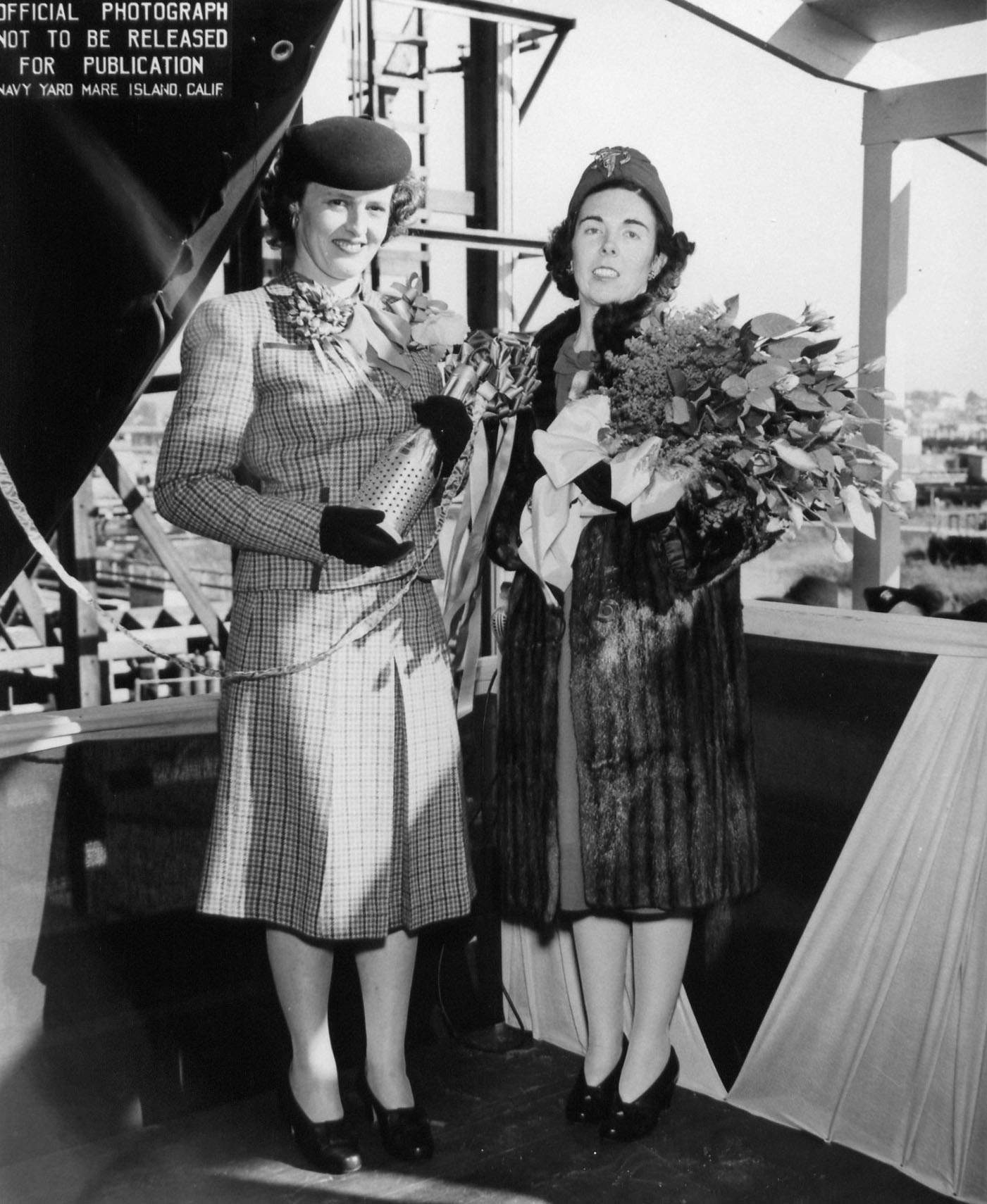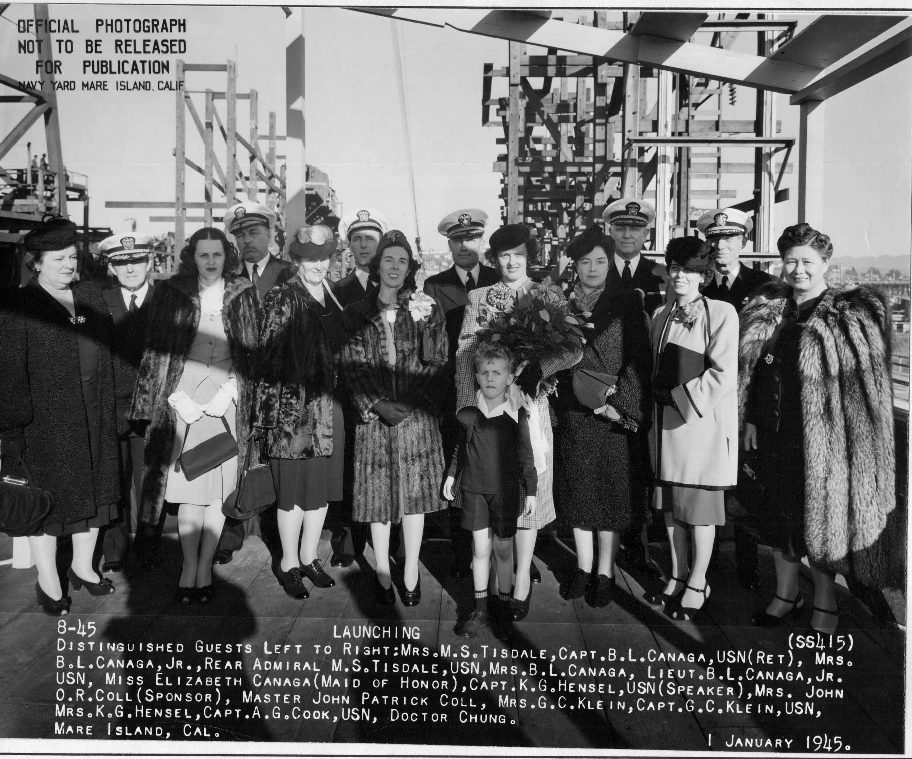 235k | The Sponsor and Maid of Honor for the launching of the Stickleback (SS-415) are seen at the bow of the submarine just prior to her launching at Mare Island on 1 January 1945. Left to right: Mrs. John O. R. Coll (Sponsor) and Miss Elizabeth Canaga (Maid of honor). | USN photo # 10-45, courtesy of Darryl L. Baker. | |