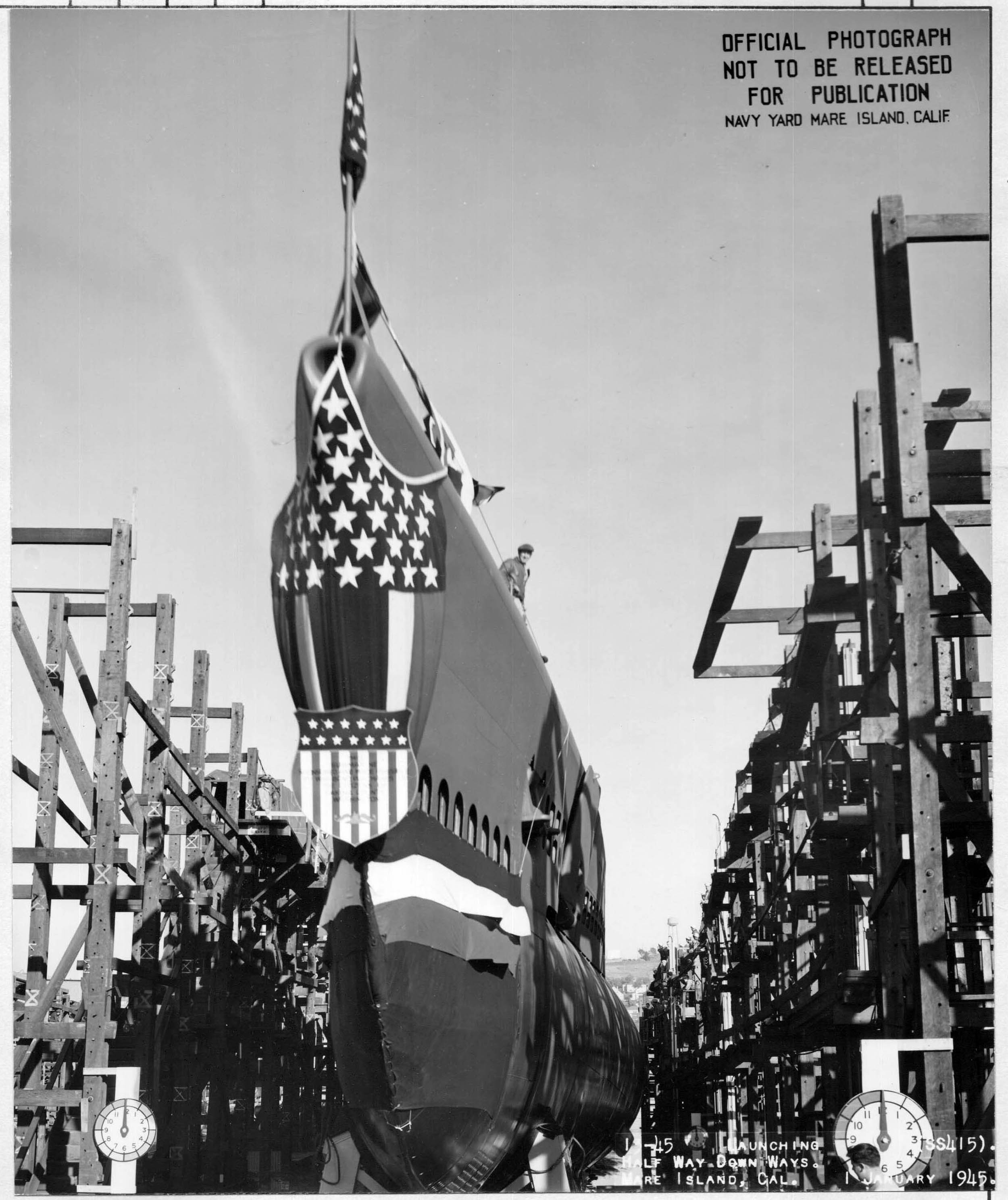 231k | Stickleback (SS-415) on the building ways prior to her launching at Mare Island on 1 January 1945. | USN photo # 12-45, courtesy of Darryl L. Baker. | |