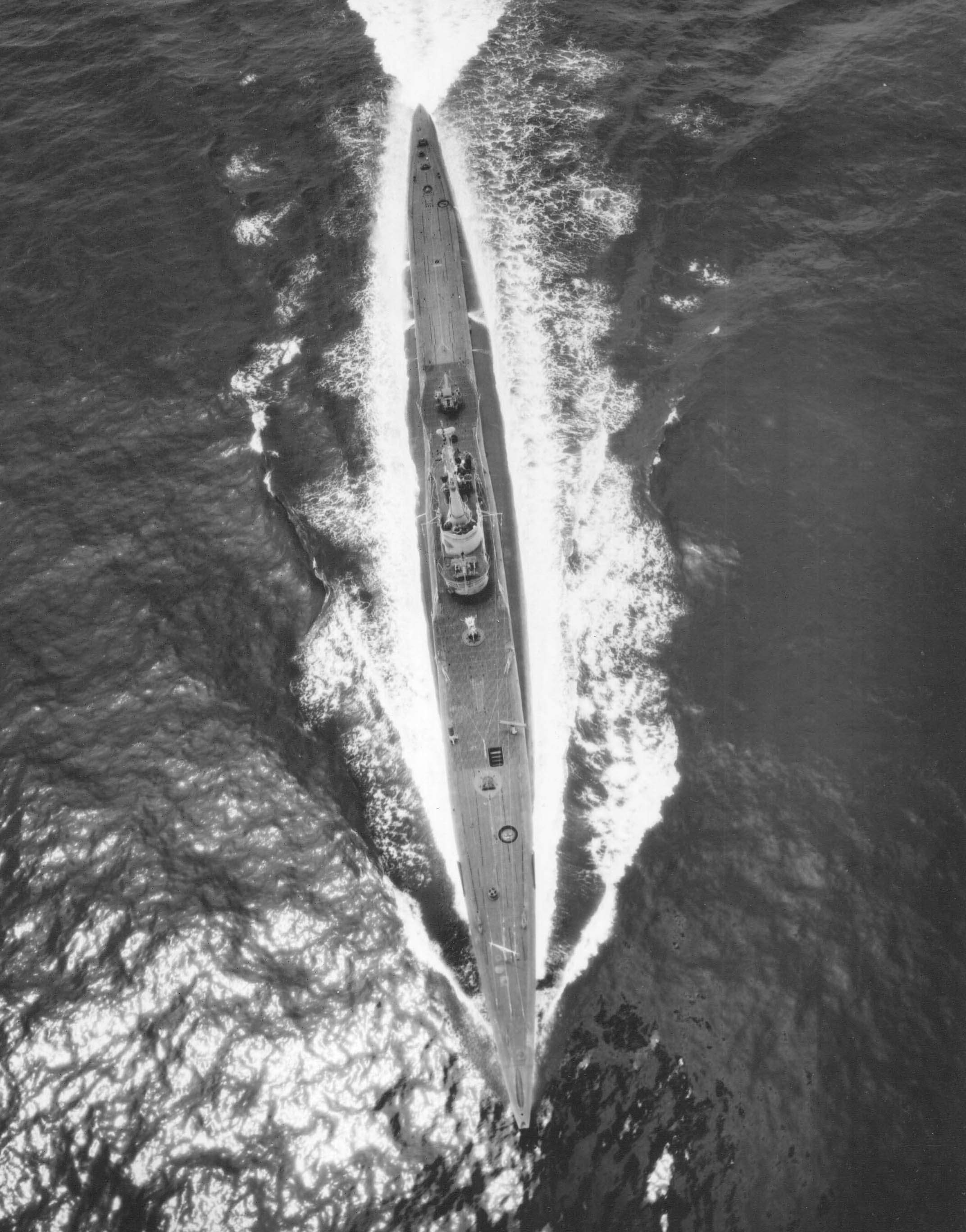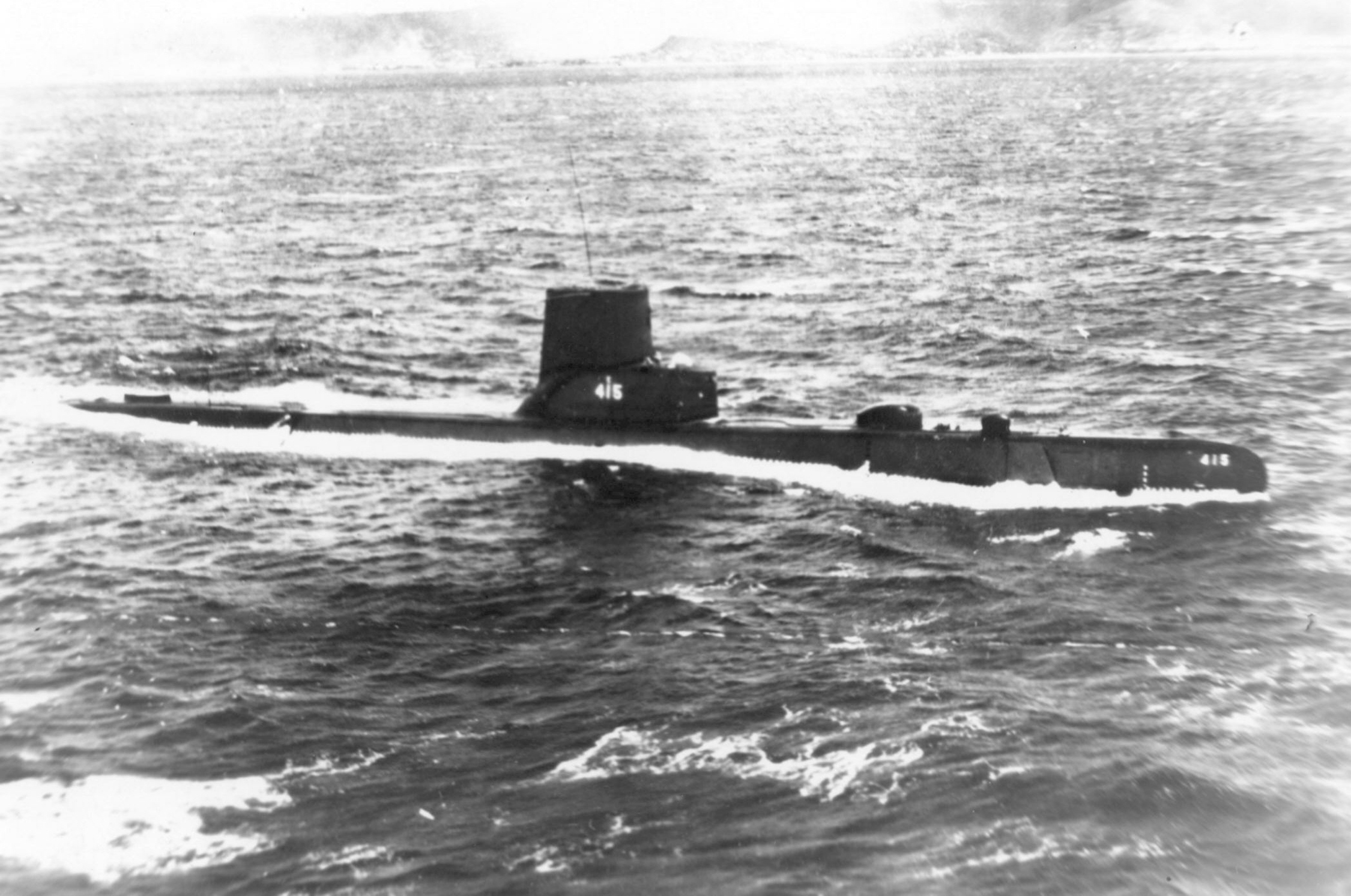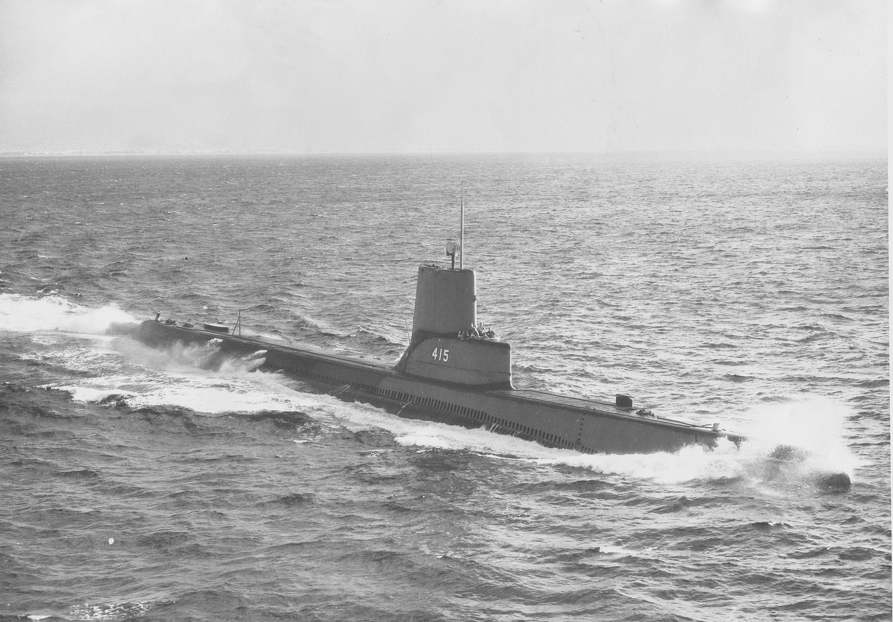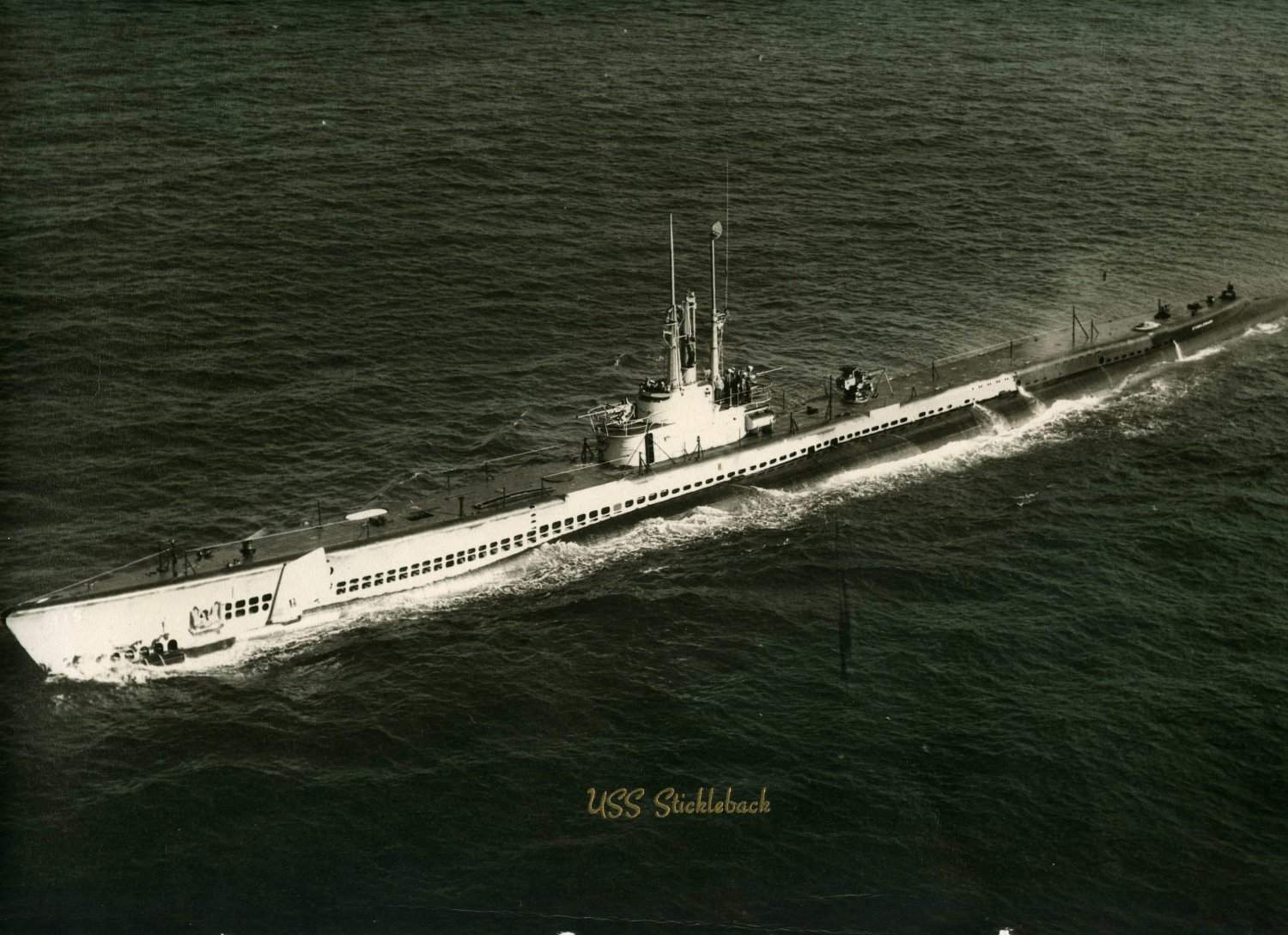 462k | Stickleback (SS-415) possibly sometime between her launching and commissioning, January - March 1945. There seems to be a small craft heading the other way barely seen behind the conning tower. You can see its wake leading from left to right up to the conning tower. |