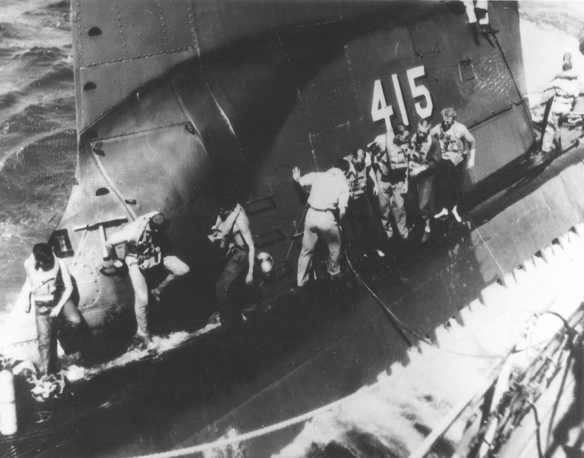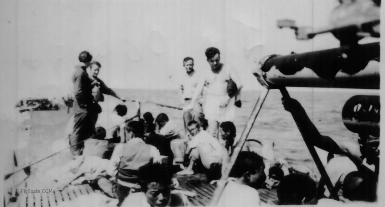 325k | Stickleback (SS-415) had only been in her patrol area in the Sea of Japan for two days when the cease-fire order was passed on 15 August 1945. She remained in the area and, on 21 August, sighted two bamboo rafts containing 19 survivors of a freighter which had been sunk 10 days before by Jallao (SS-368). They were taken on board for 18 hours, given food, water, medical treatment, and set afloat again a short distance from one of the Japanese islands. This photo shows the rescued men on the fore-deck of the Stickleback receiving aid. The two rafts were pulled aboard and lashed to the aft decks. Upon commissioning the crew was replaced, almost to the man, by the crew from the Salmon (SS-182) who was so badly damaged by Japanese attacks that she never dove again and was decommissioned an operational loss. In reward for bringing the highly damaged submarine home the crew was rewarded with a brand new boat and were sent out on another war patrol with Stickleback. Her only war patrol as it urned out. |