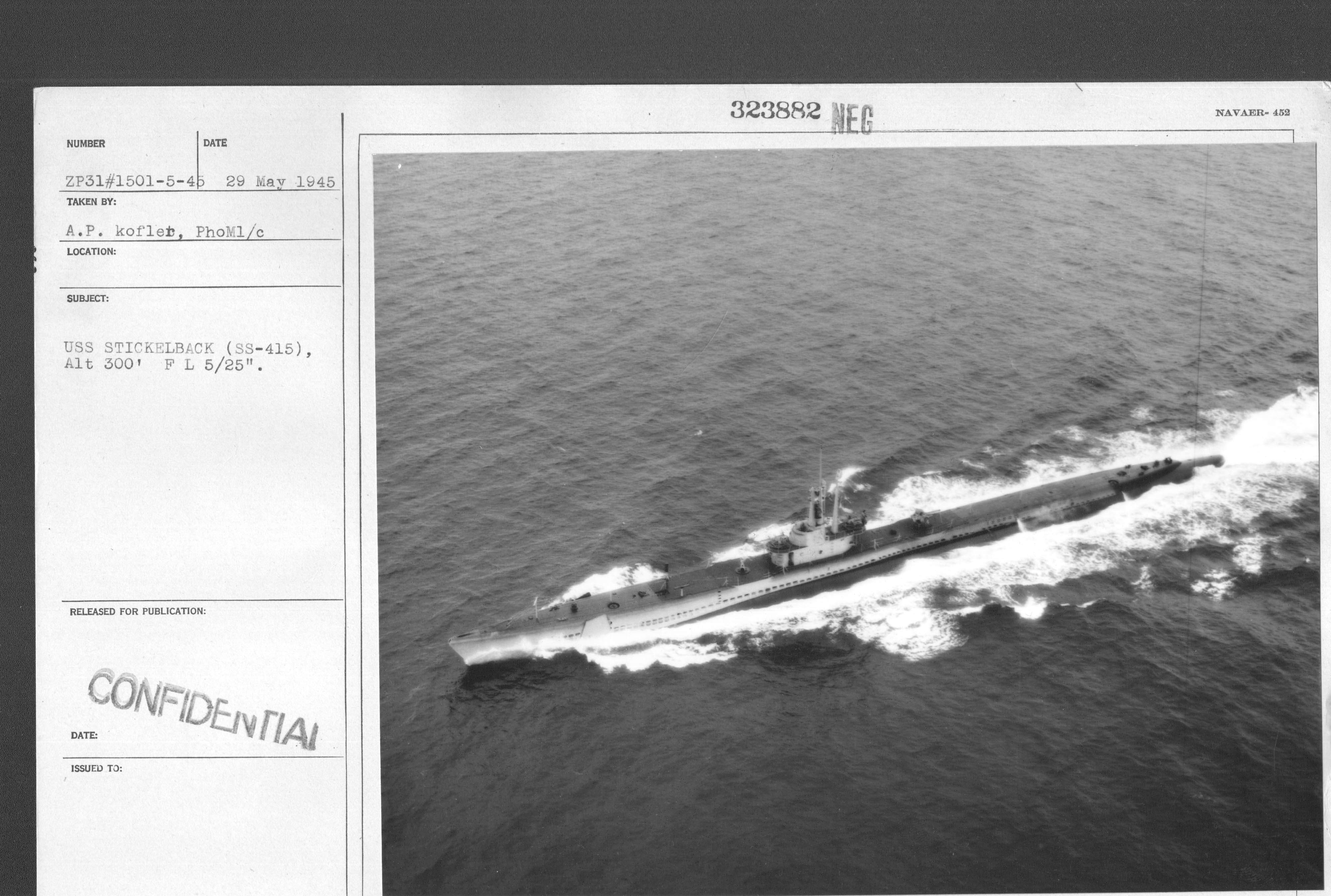 ![]() | 543k | Stickleback (SS-415) viewed from the airship ZP-31 on 29 May 1945 at an altitude of 300 feet. | USN photos # 80-G-323884 & 323883 from National Archives and Records Administration (NARA), College Park, Maryland, courtesy of Sean Hert. | |