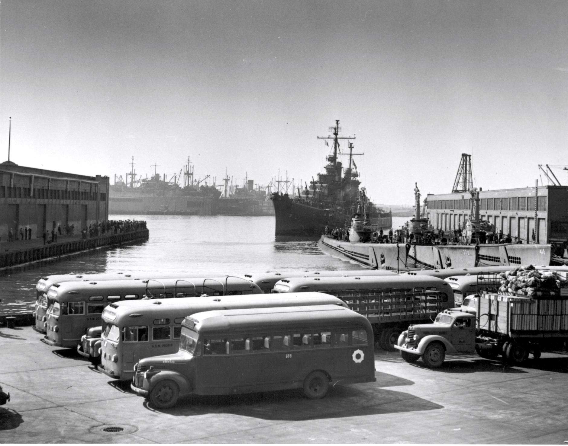 ![]() | 97k | The Oakland (CL-95) docking in Oakland, California, her name sake city, on 20 October 1945 returning home after World War Two. The three subs in the photo are (from left) - Thresher (SS-200), Kraken (SS-370), and Stickleback (SS-415). | Photo i.d. courtesy of Robert Morgan, & Ric Hedman & David Johnston Photo courtesy of Mike Brock via Tom Bateman. |