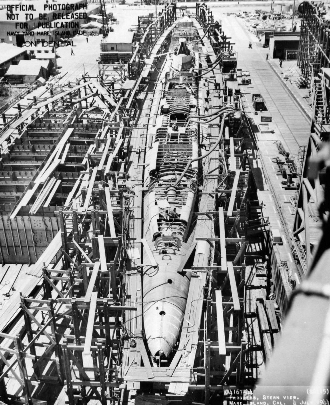 350k | Stern view of the Stickleback (SS-415) on the building ways at Mare Island on 4 July 1944. A canceled destroyer escort is on the ways on the right side. | USN photo # 4167-44, courtesy of Darryl L. Baker. | |