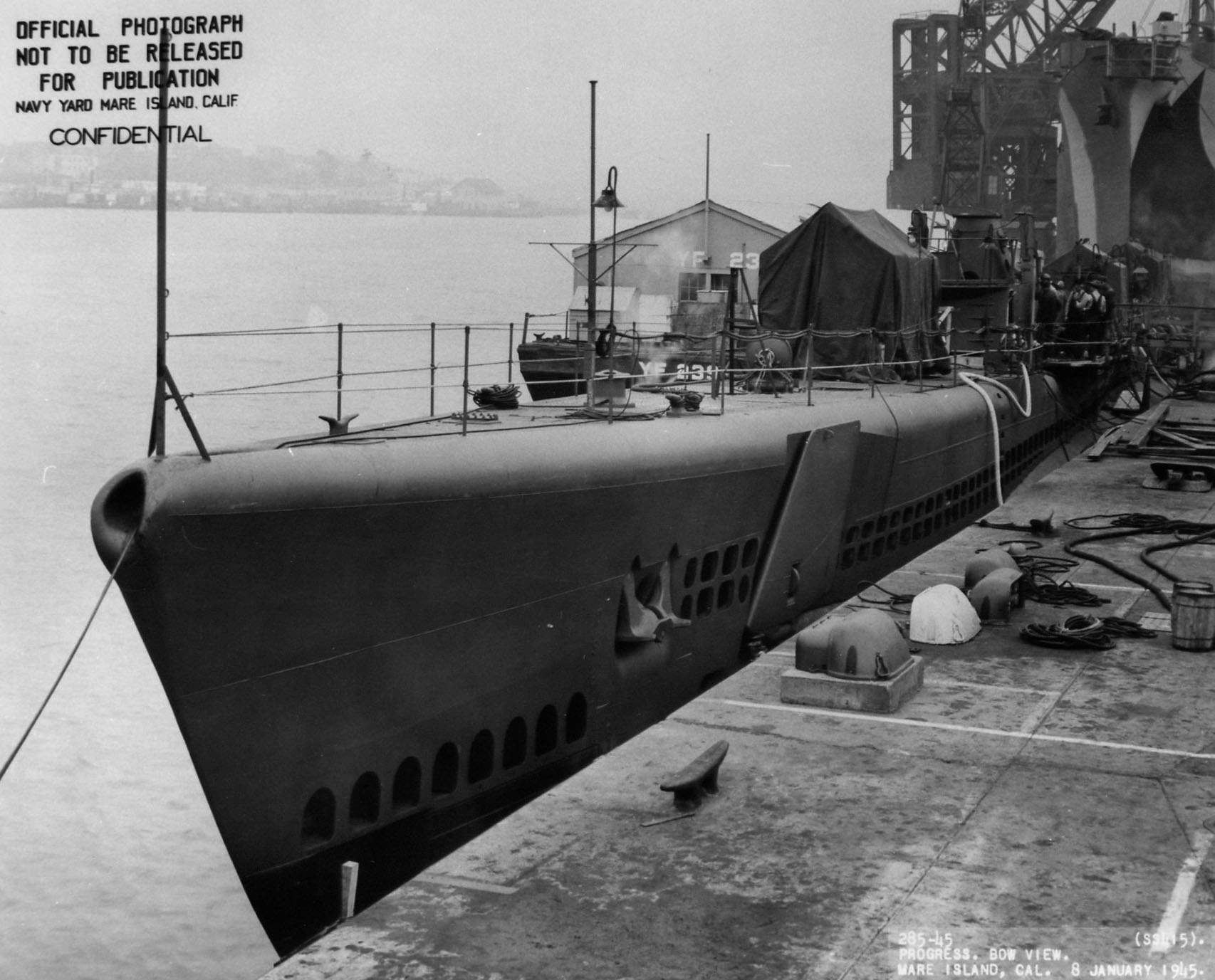 211k | Stickleback (SS-415) at her outfitting berth at Mare Island on 8 January 1945. Nereus (AS-17) is berthed aft of Stickleback at her outfitting berth. | USN photo # 285-45, courtesy of Darryl L. Baker. | |