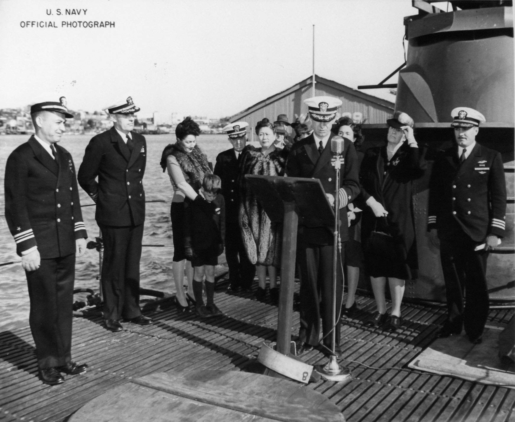 211k | Capt. Cook, Captain of the Yard, Mare Island, places the Stickleback (SS-415) into commission at the yard on 29 March 1945. Stickleback's first commanding officer, CDR Lawrence G. Bernard is to the far right. | USN photo # 2255-45, courtesy of Darryl L. Baker. | |