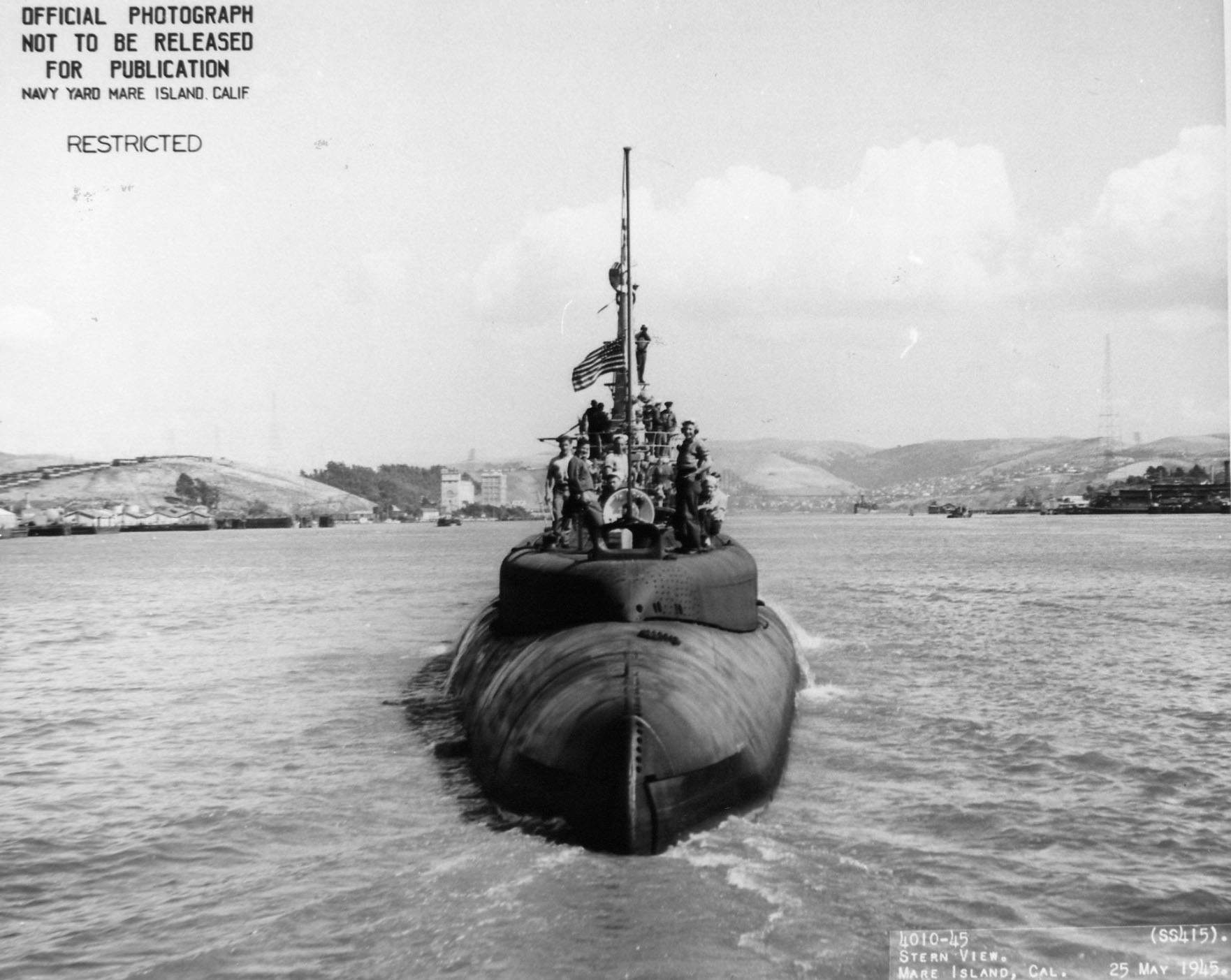 196k | Stern view of Stickleback (SS-415) departing Mare Island on 25 May 1945. | USN photo # 4010-45, courtesy of Darryl L. Baker. | |