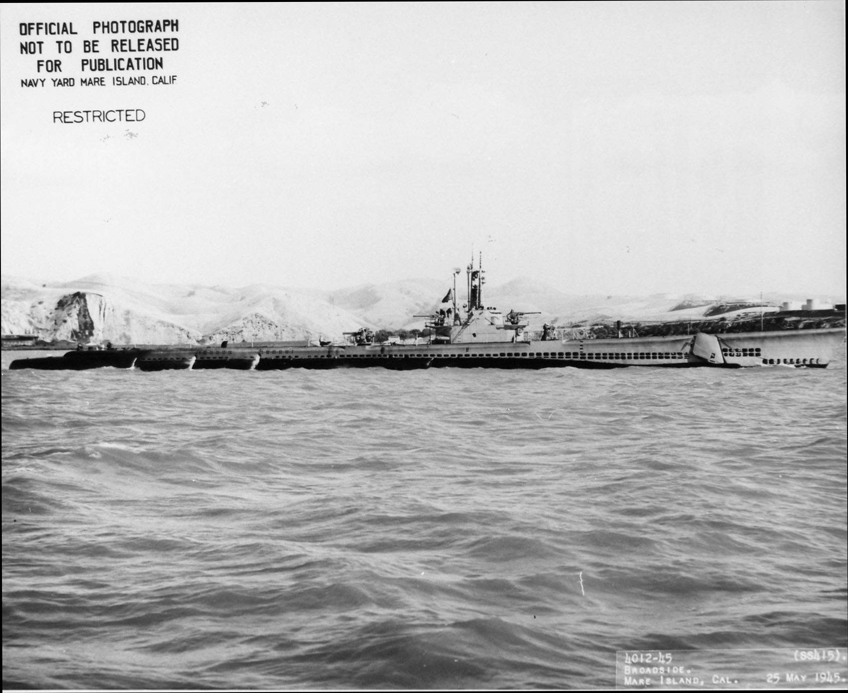 188k | Broadside view of Stickleback (SS-415) departing Mare Island on 25 May 1945. | USN photo # 4012-45, courtesy of Darryl L. Baker. | |