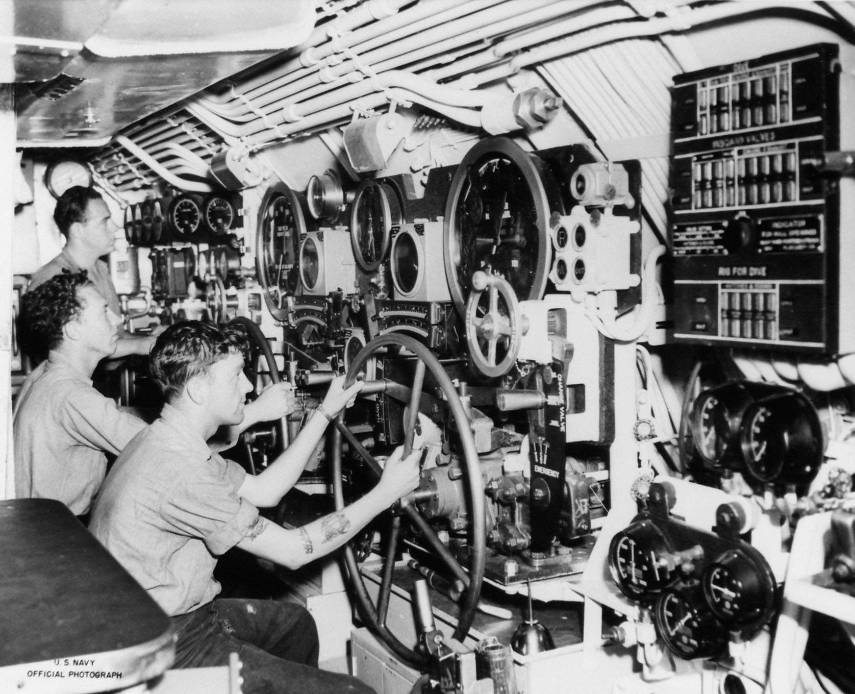 248k | Photo of diving control station aboard Stickleback (SS-415) at Mare Island on 13 June 1945. | USN photo # 4465-45, courtesy of Darryl L. Baker. | |