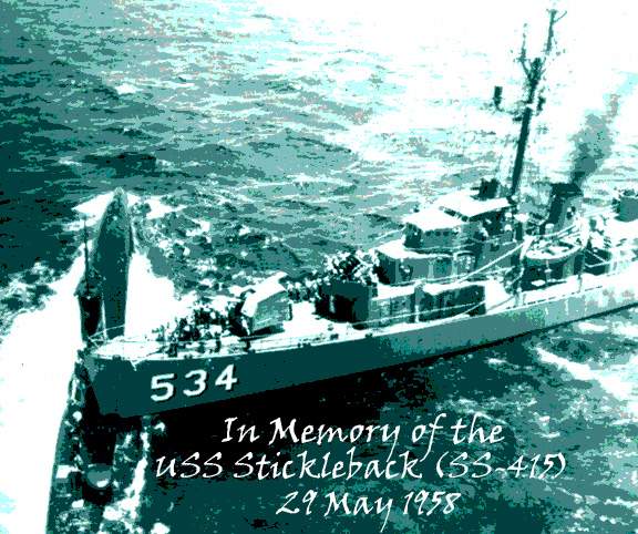 62k | Commemorative photo in memory of the Stickleback (SS-415). | Photo courtesy of Tom Kermen. | |