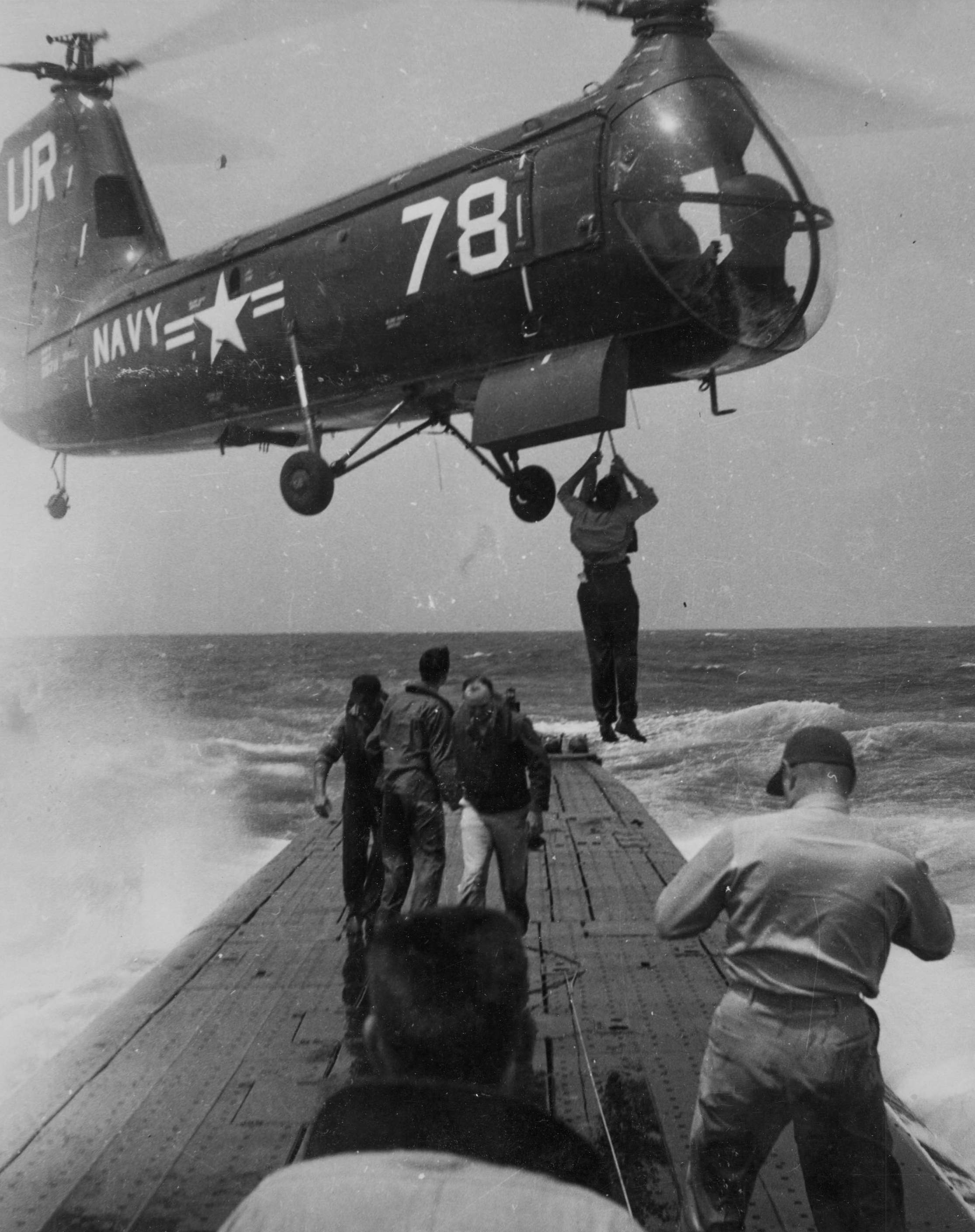 2.19k | Mumps" Hilburn Tench (SS-417) is rescued by a helicopter, circa early 1950's. | Photo courtesy of Anonymous. | |