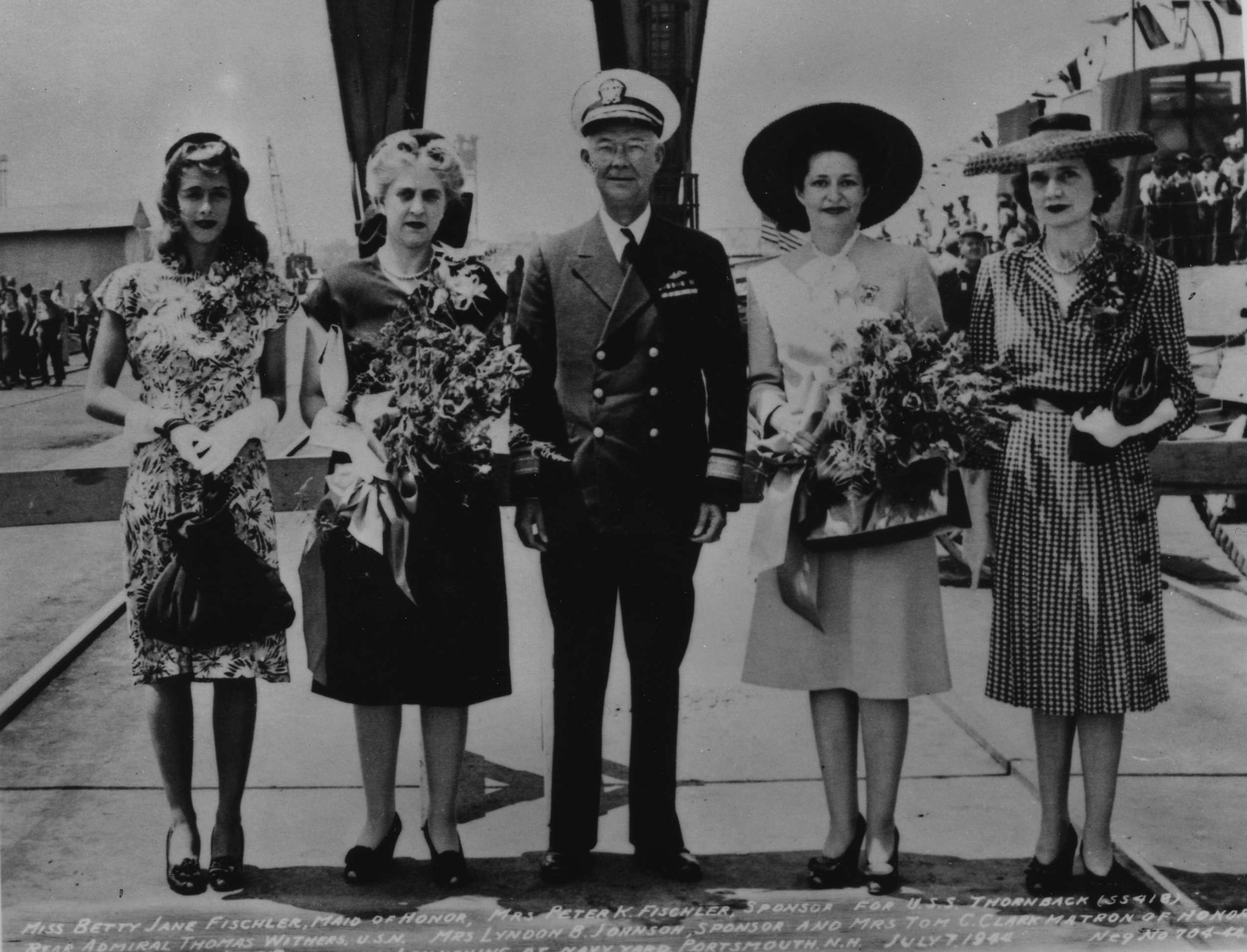 ![]() | 1.75k | From left to right: Miss Betty Jane Fischler, Maid of Honor, Mrs. Peter K. Fischler, Sponsor for Thornback (SS-418); Rear Admiral Thomas Withers, USN, Mrs. Lyndon B. Johnson, Sponsor, & Mrs. Tom C. Clark, Matron of Honor for Tench (SS-417) at twin launching at Navy Yard, Portsmouth, N.H. 7 July 1944. | Photo courtesy of Jacqueline Thornburg, LBJ Library and Museum A/V Archives Technician/Special Emphasis Program Manager. | |