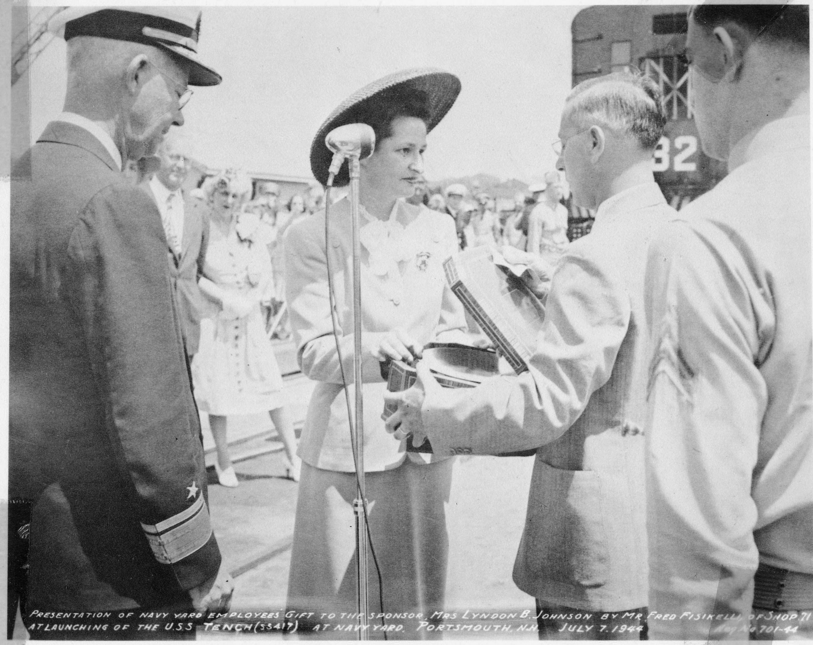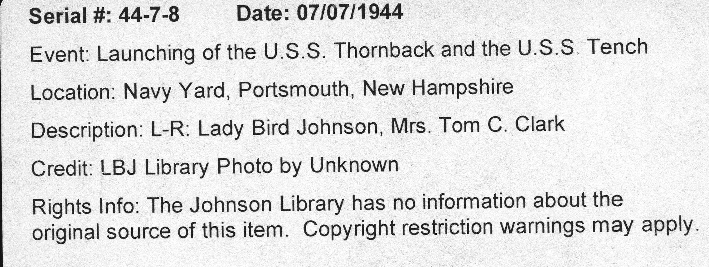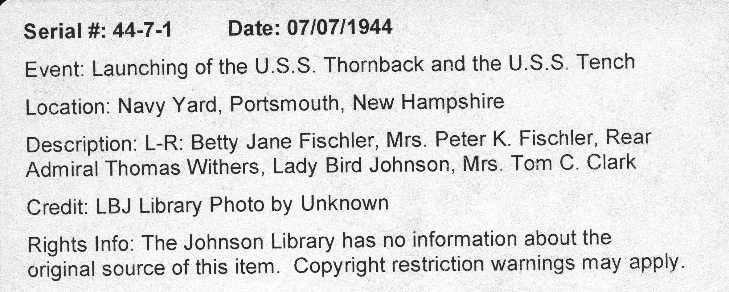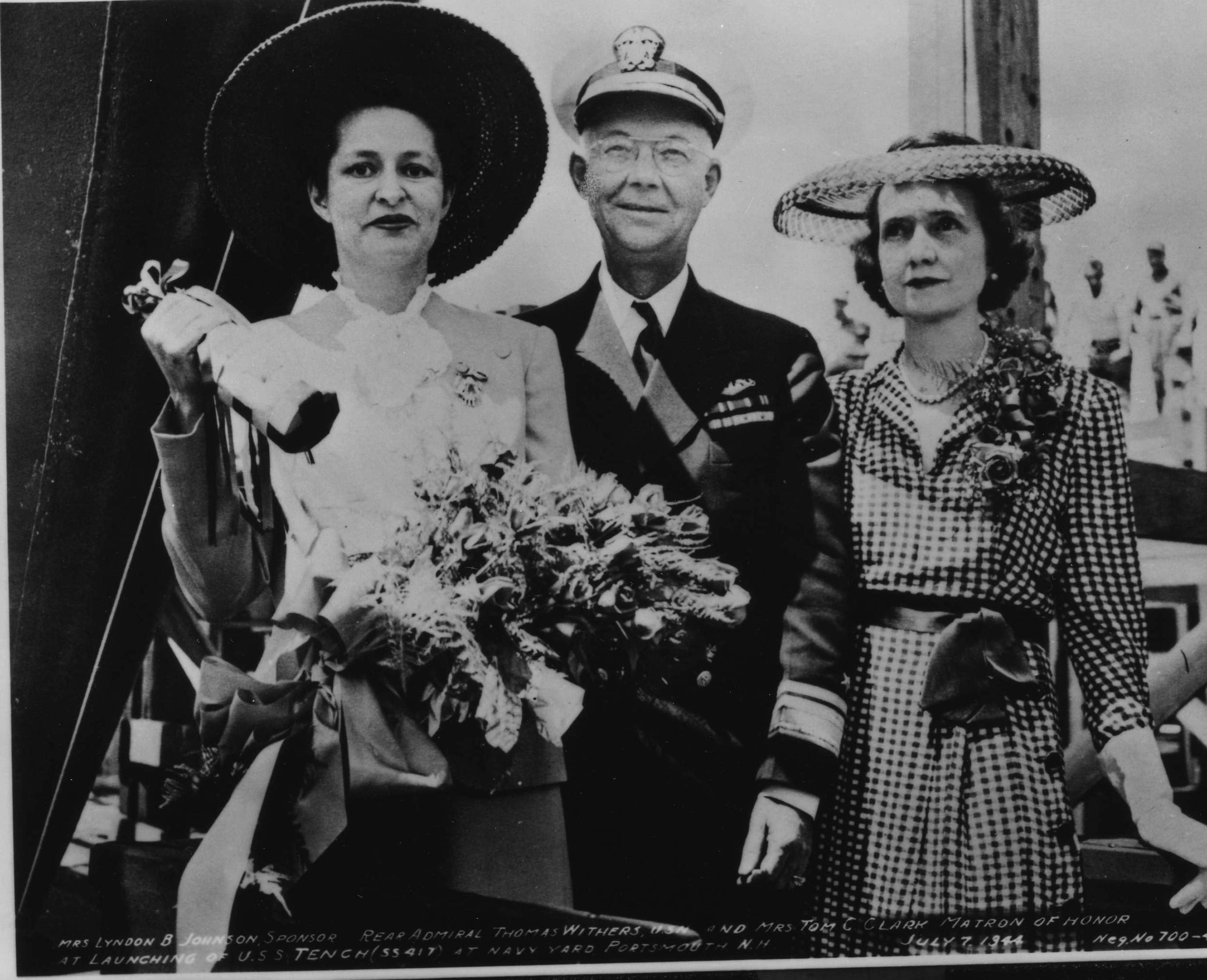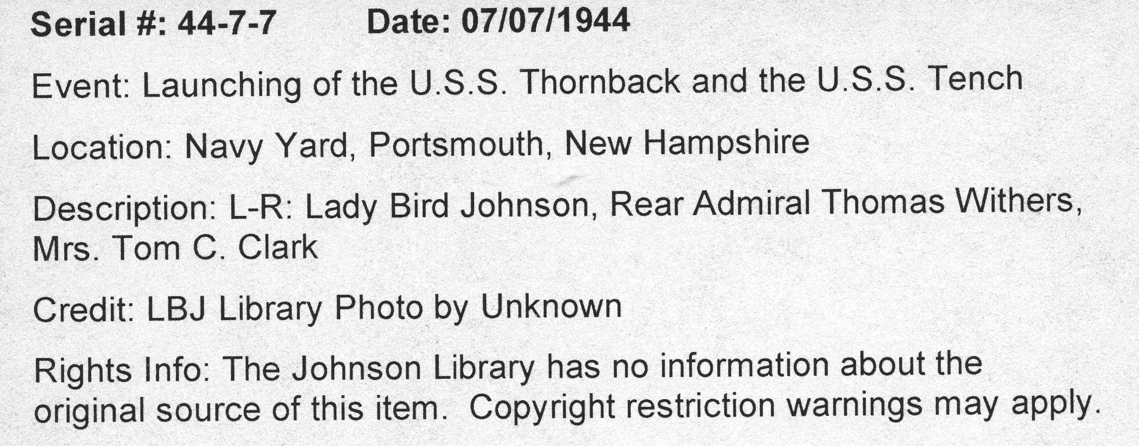 ![]() | 1.65k | Mrs. Lyndon B. Johnson, Sponsor, Rear Admiral Thomas Withers, USN, & Mrs. Tom C. Clark, Matron of Honor for Tench (SS-417) at Navy Yard, Portsmouth, N.H. 7 July 1944. | Photo courtesy of Jacqueline Thornburg, LBJ Library and Museum A/V Archives Technician/Special Emphasis Program Manager. | |