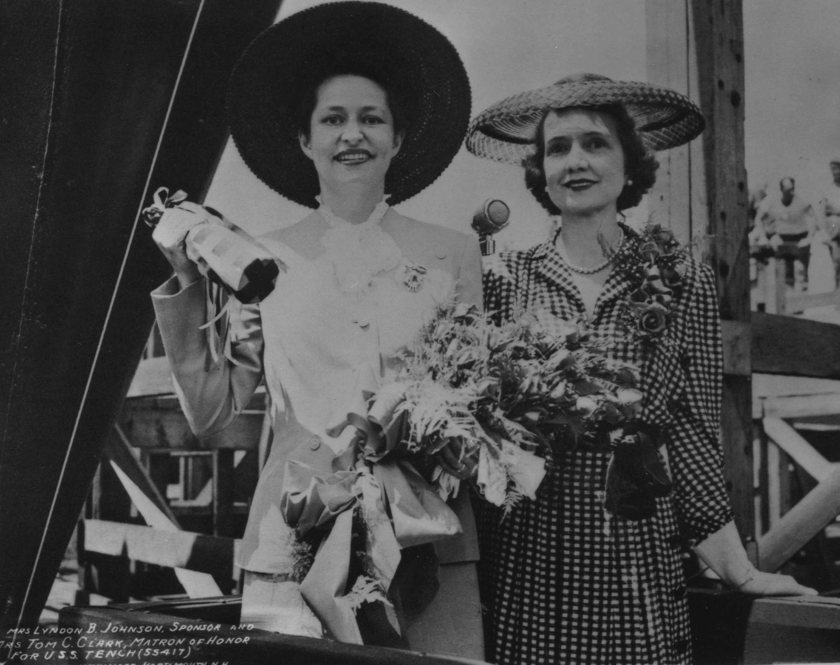 ![]() | 1.77k | Mrs. Lyndon B. Johnson, Sponsor & Mrs. Tom C. Clark, Matron of Honor for Tench (SS-417) with the launching bottle prior to christening of the submarine at Navy Yard, Portsmouth, N.H. 7 July 1944. | Photo courtesy of Jacqueline Thornburg, LBJ Library and Museum A/V Archives Technician/Special Emphasis Program Manager. | |