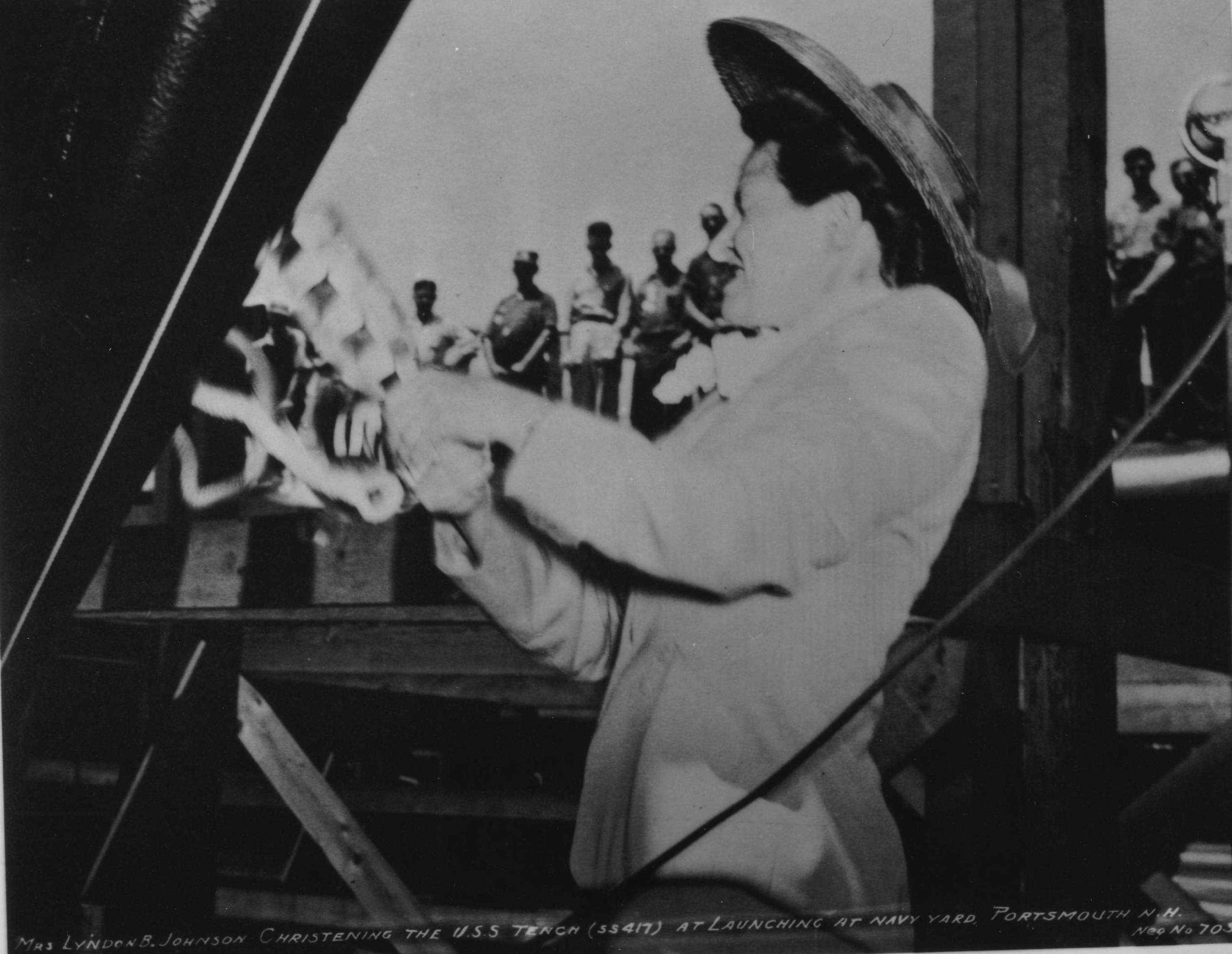 ![]() | 1.54k | Lady Bird Johnson christens the Tench (SS-417) at Navy Yard, Portsmouth, N.H., 7 July 1944. | Photo courtesy of Jacqueline Thornburg, LBJ Library and Museum A/V Archives Technician/Special Emphasis Program Manager. | |