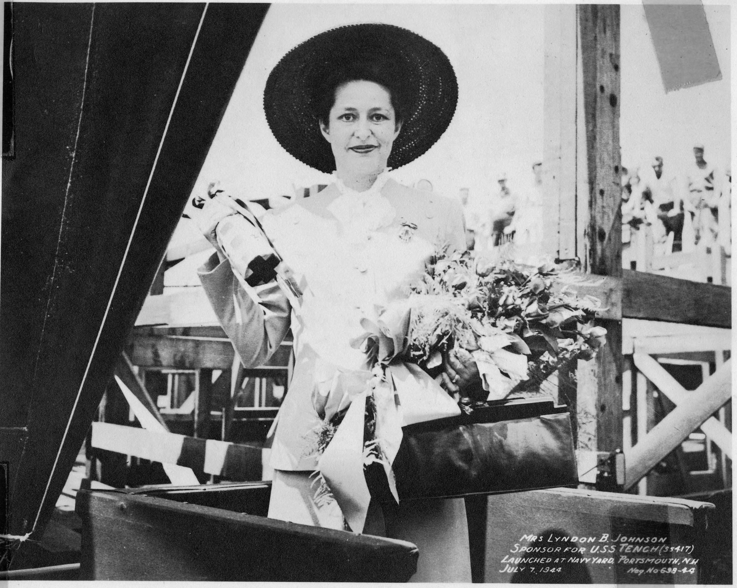 ![]() | 593k | Lady Bird Johnson, future First Lady, posing immediately prior to the christening of the Tench (SS-417) at Navy Yard, Portsmouth, N.H., 7 July 1944. | National Archives Identifier: 7431688 Photo courtesy of catalog.archives.gov |