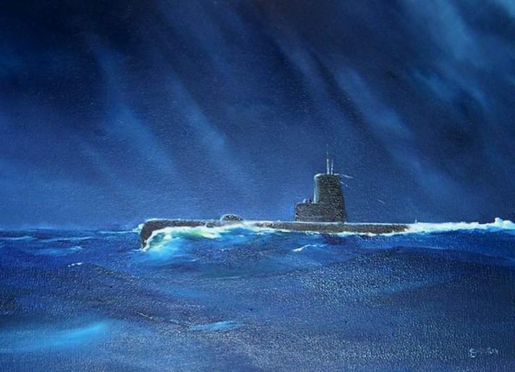 ![]() | 49k | Oil on canvas by the artist Jim Christley entitled "Night Run" shows a Guppy submarine similar to the Tench (SS-417). The deck was cleared of protrusions such as antenna supports and deck guns. The bow and superstructure were smoothed and a fairing built around the bridge and the support structure for the antennas and periscopes. A snorkel system was added to allow the boat to run on its diesel engines while submerged. Most of the time, however, the boats transited on the surface where their speed could be used to advantage. | Photo & text courtesy of subart.net. | |