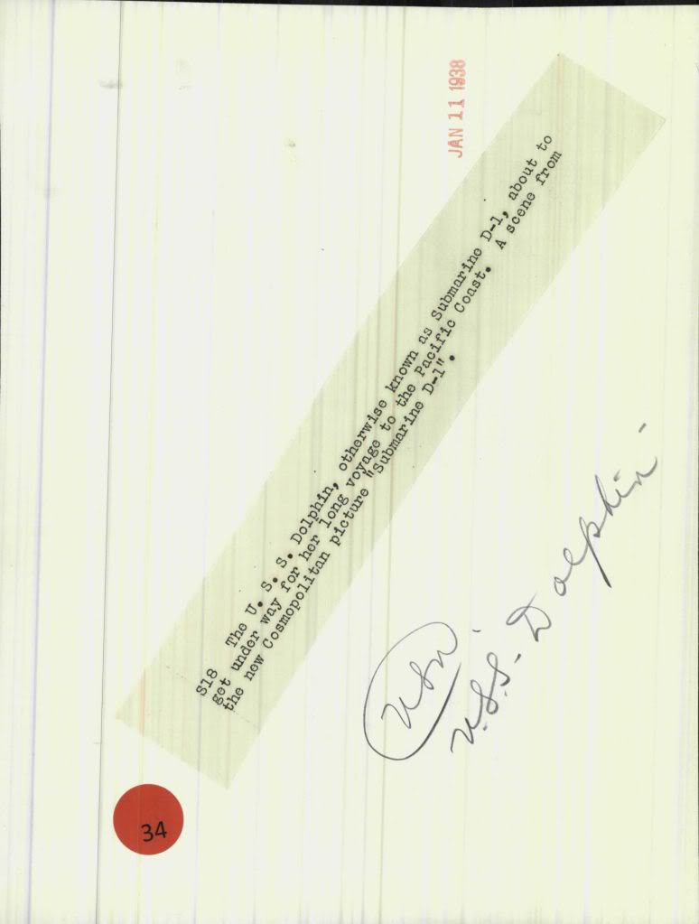 ![]() | 741k | SUBMARINE D-1 with PAT O'BRIEN, GEORGE BRENT, WAYNE MORRIS stars the real life Dolphin (SS-169) on 11 January 1938. | AP Wire photo courtesy of Ron Reeves (of blessed memory). Insert photo & text by Evening Star. [volume] (Washington, D.C.) 1854-1972, 01 January 1938, Page B-12, Image 26, courtesy of chroniclingamerica.loc.gov. |