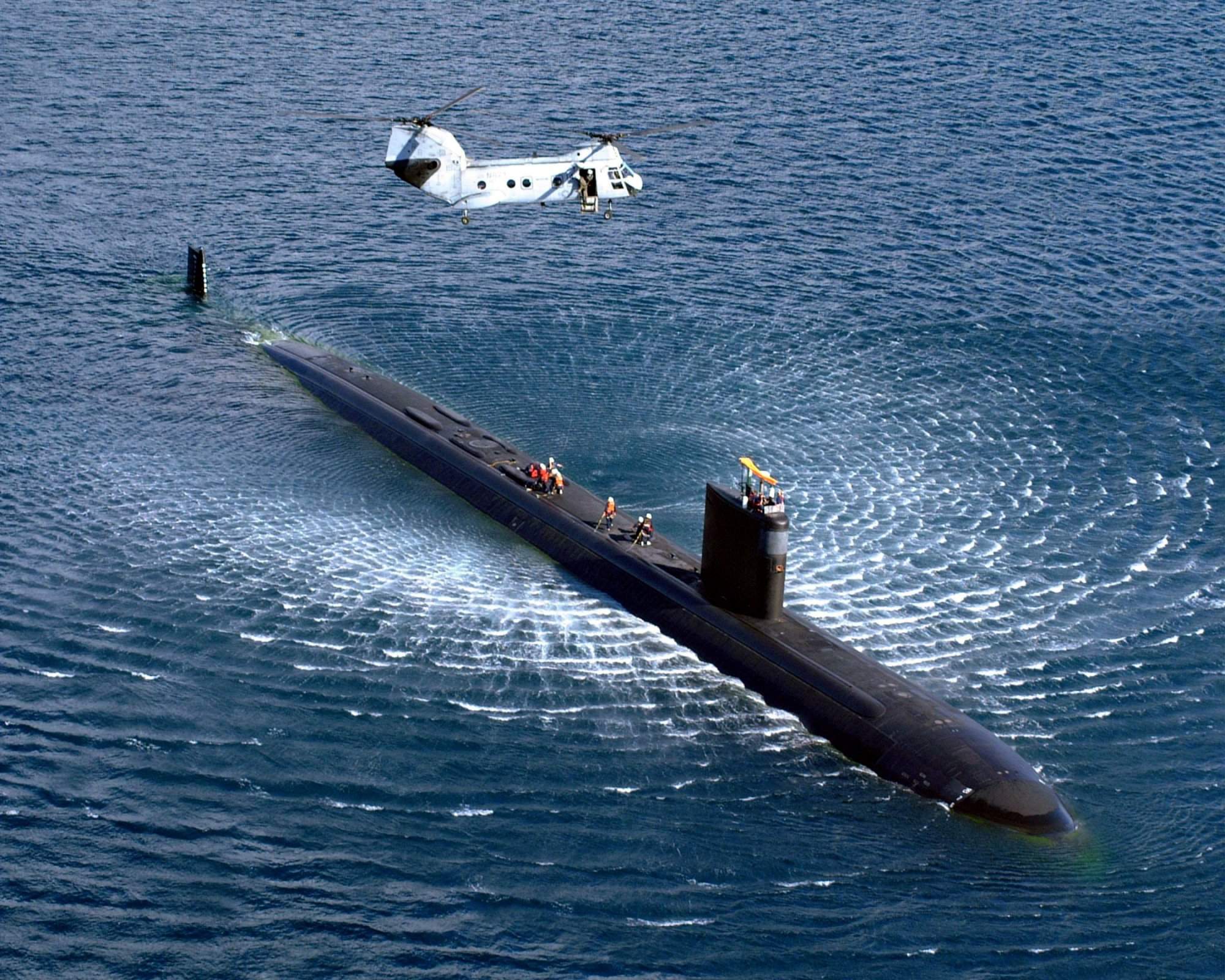 ![]() | 682k | Crew members aboard a U.S. Navy submarine,possibly either the Charlotte (SSN-766) or Greeneville (SSN-772), conduct an Emergency Personnel Transfer Hoist training exercise with a CH-46 "Sea Knight" helicopter from Helicopter Combat Support Squadron Five (HC-5) in Apra Harbor, Guam on 7 Novbember 2001. Note: The flat domes on the aft deck are attachment points for the Dry Deck Shelter or Advanced Seal Delivery Vehicle. The "tiles" on the hull of the boat are a rubberized anechoic tile attached to the outer hull to help absorb active sonar pulses. | USN photo # N-3889M-003 by Photographer's Mate 2nd Class Marjorie McNamee, courtesy of news.navy.mil. Partial text courtesy of David Johnston |