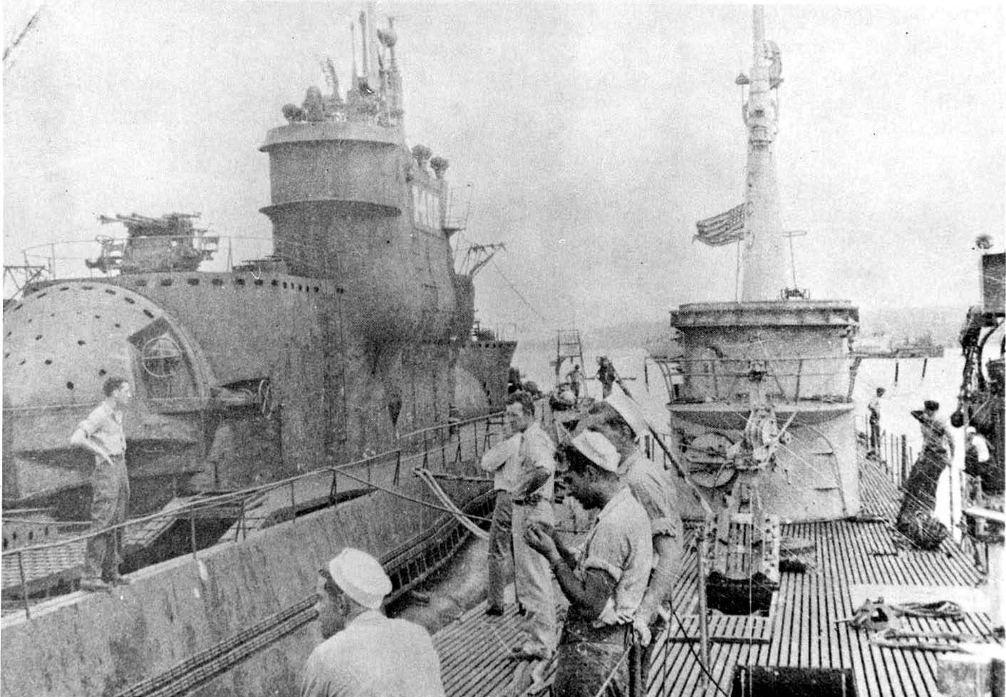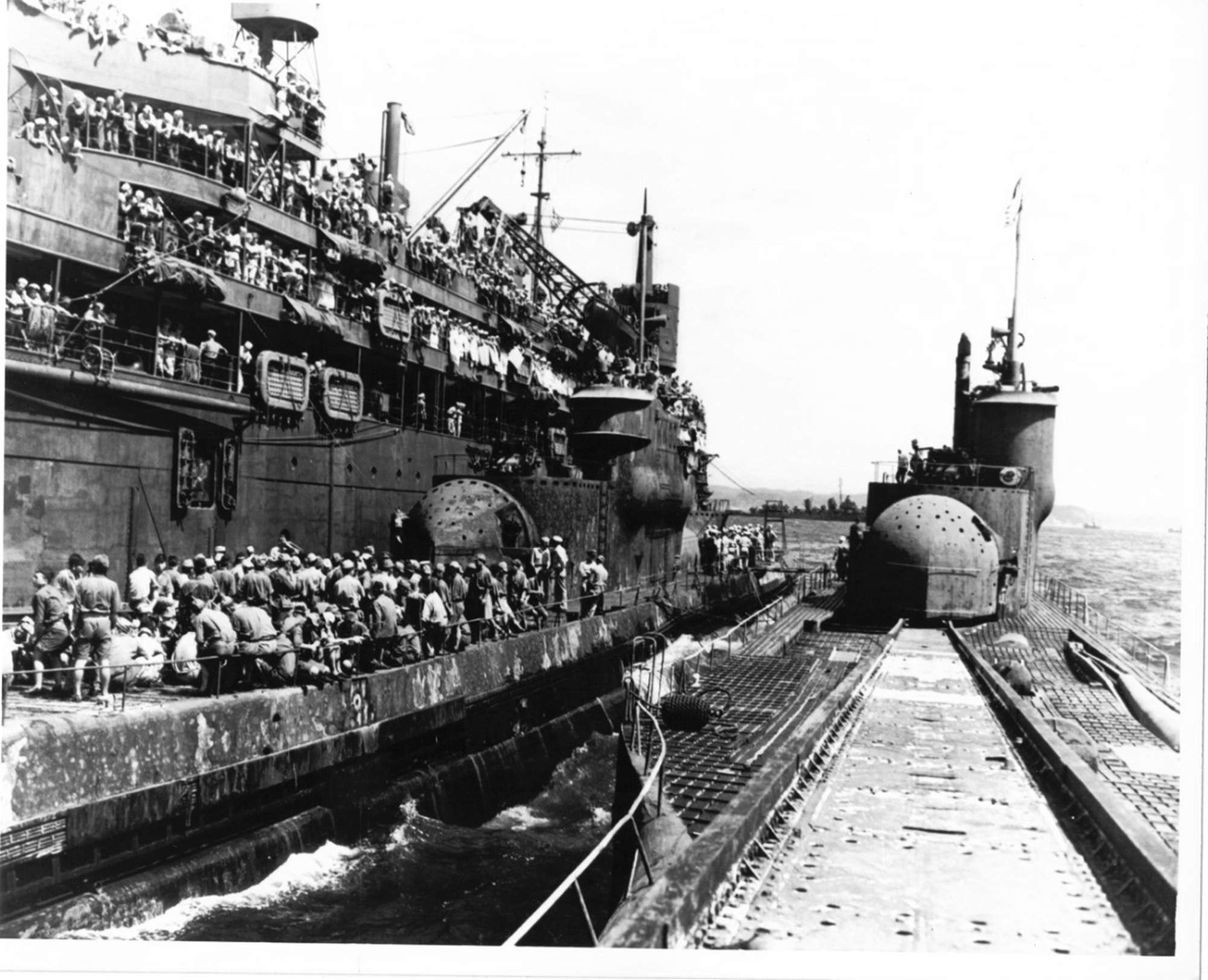 3.52k | Flying black flags of surrender, two Japanese submarines which bowed to American forces 200 miles off the Japanese mainland rest at anchor alongside a giant transport. This photo showing the sterns of the underseas raiders was made by a Coast Guard combat photographer aboard a Coast Guard-manned LST which was among the first cargo-bearing vessels to reach Japan. Photo taken from LST-789 on 30 August 1945. | National Archives Identifier: 205585303 Local Identifier: 26-G-4782 Photo courtesy of catalog.archives.gov via David Upton via Gary Priolo. |