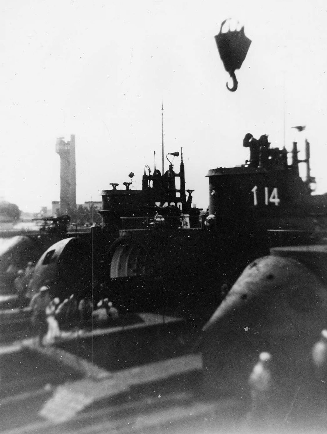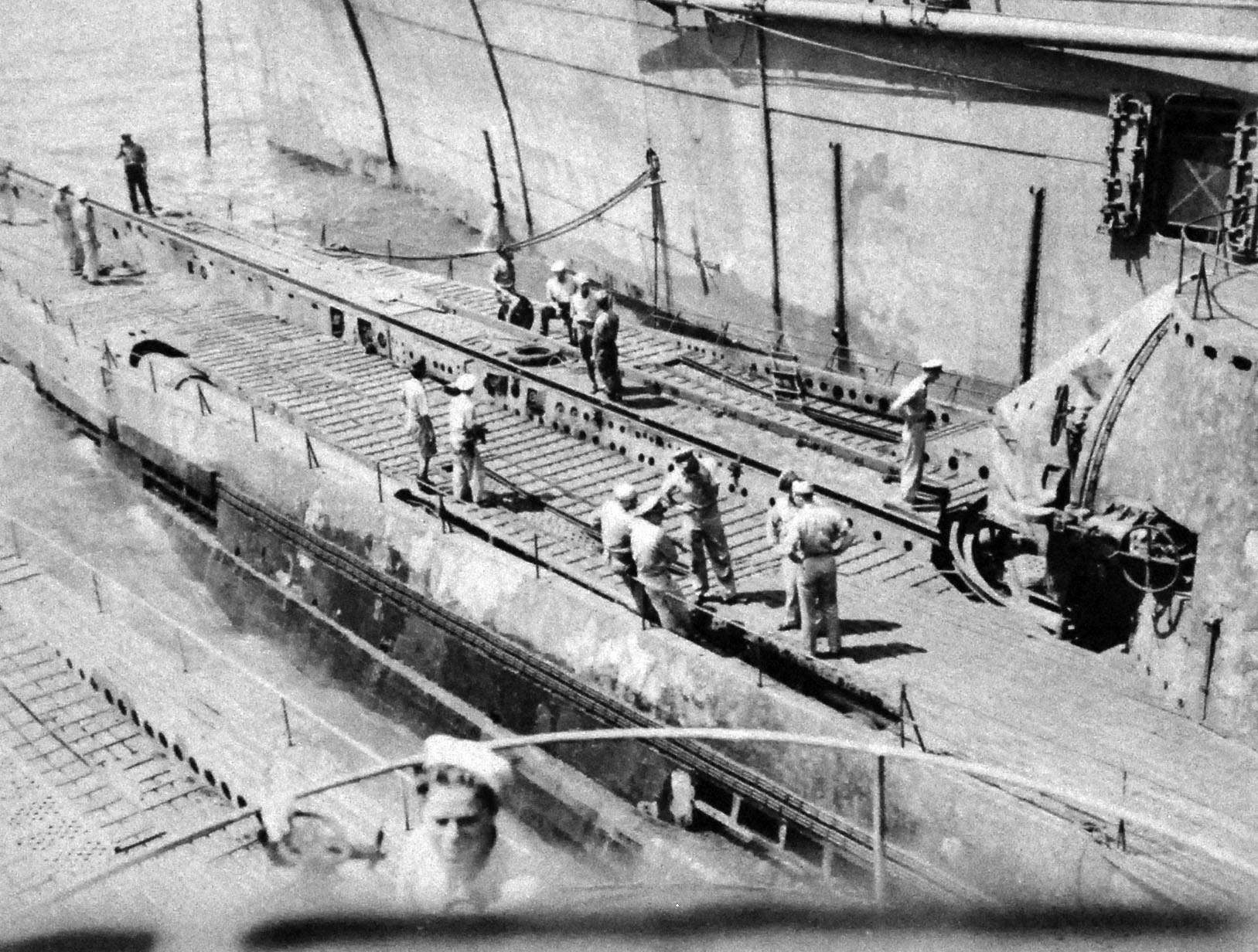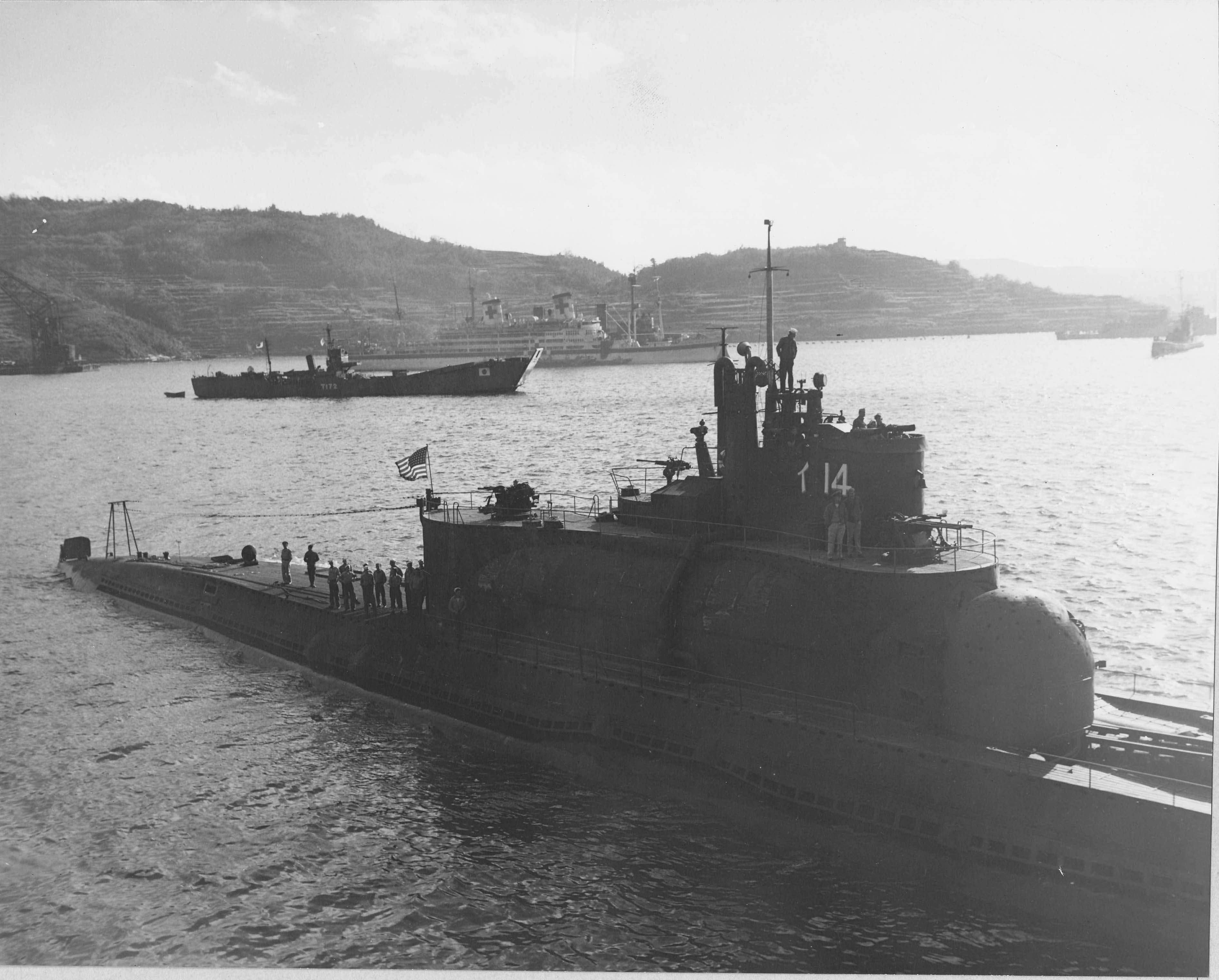![]() | 876k | I-14 as seen from the Euryale (AS-22), 5 November 1945. In the background is a hospital ship and a landing craft. |