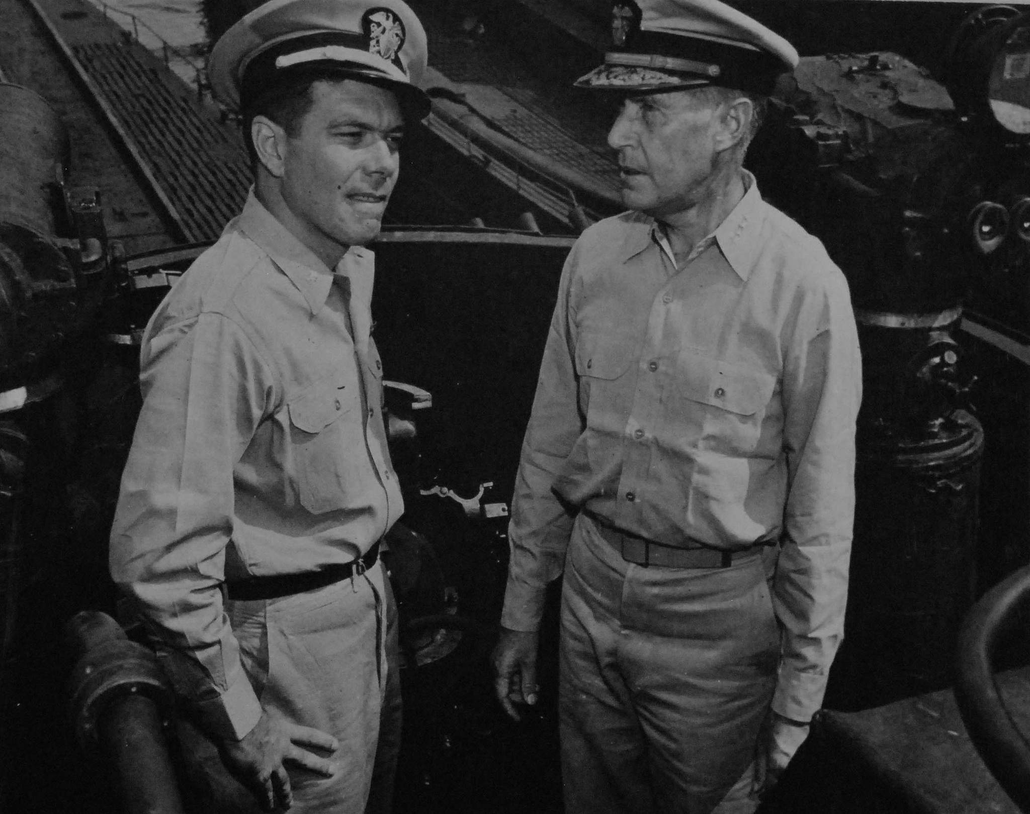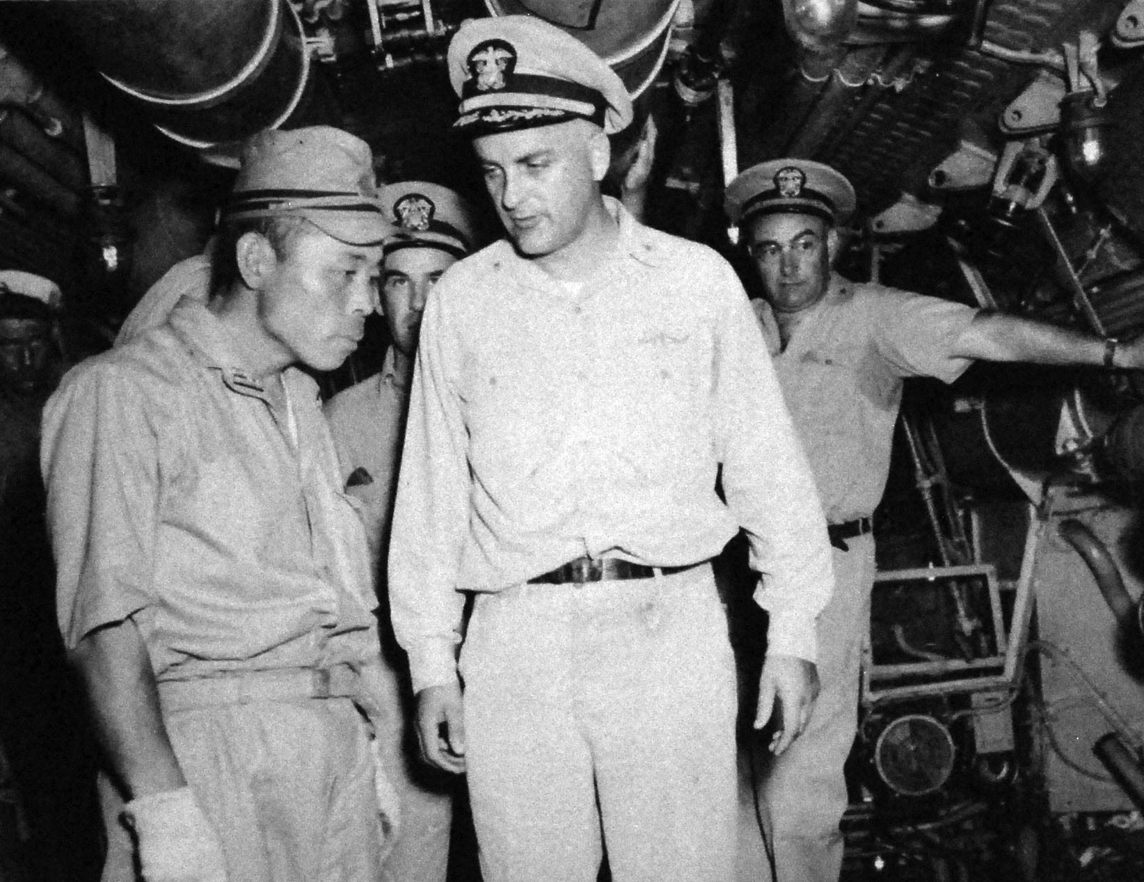 ![]() | 266k | On board the captured Japanese submarine, I-401, at Yokosuka, Japan, Admiral Raymond A. Spruance looks over this latest command of his son, Commander Edward Spruance, 1 October 1945. | USN photo # 80-G-495765, courtesy of the Library of Congress, from the National Museum of the U.S. Navy, courtesy of flickr.com. | |