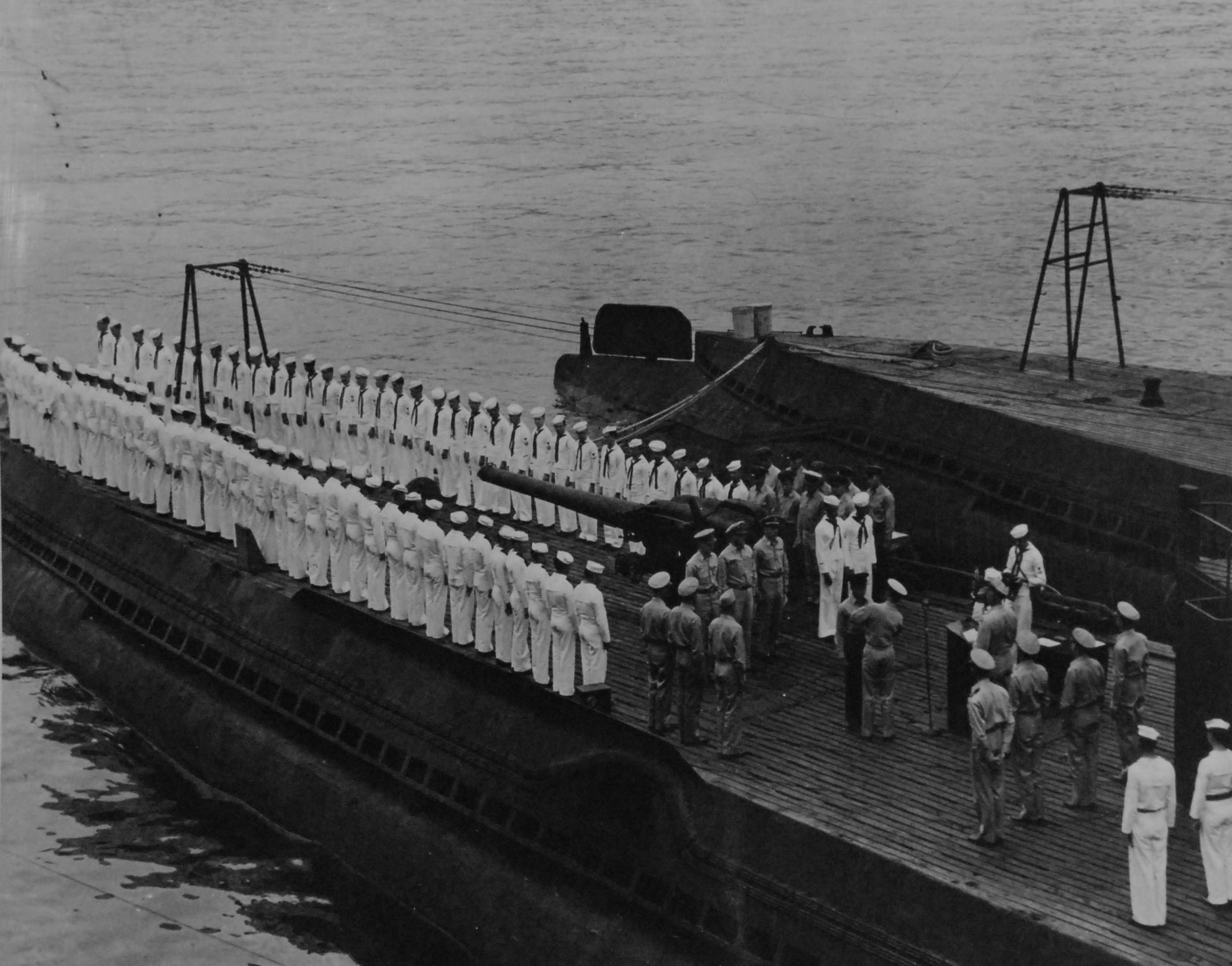 ![]() | 415k | Officers and men of the US Navy witness the presentation of awards to members of the US Navy's Submarine Force by Admiral Raymond A. Spruance, Commander Fifth Fleet on the fantail of the ex-Japanese submarine, I-401, at Yokosuka, Japan. | USN photo # 80-G-495764, courtesy of the Library of Congress, from the National Museum of the U.S. Navy, courtesy of flickr.com. | |