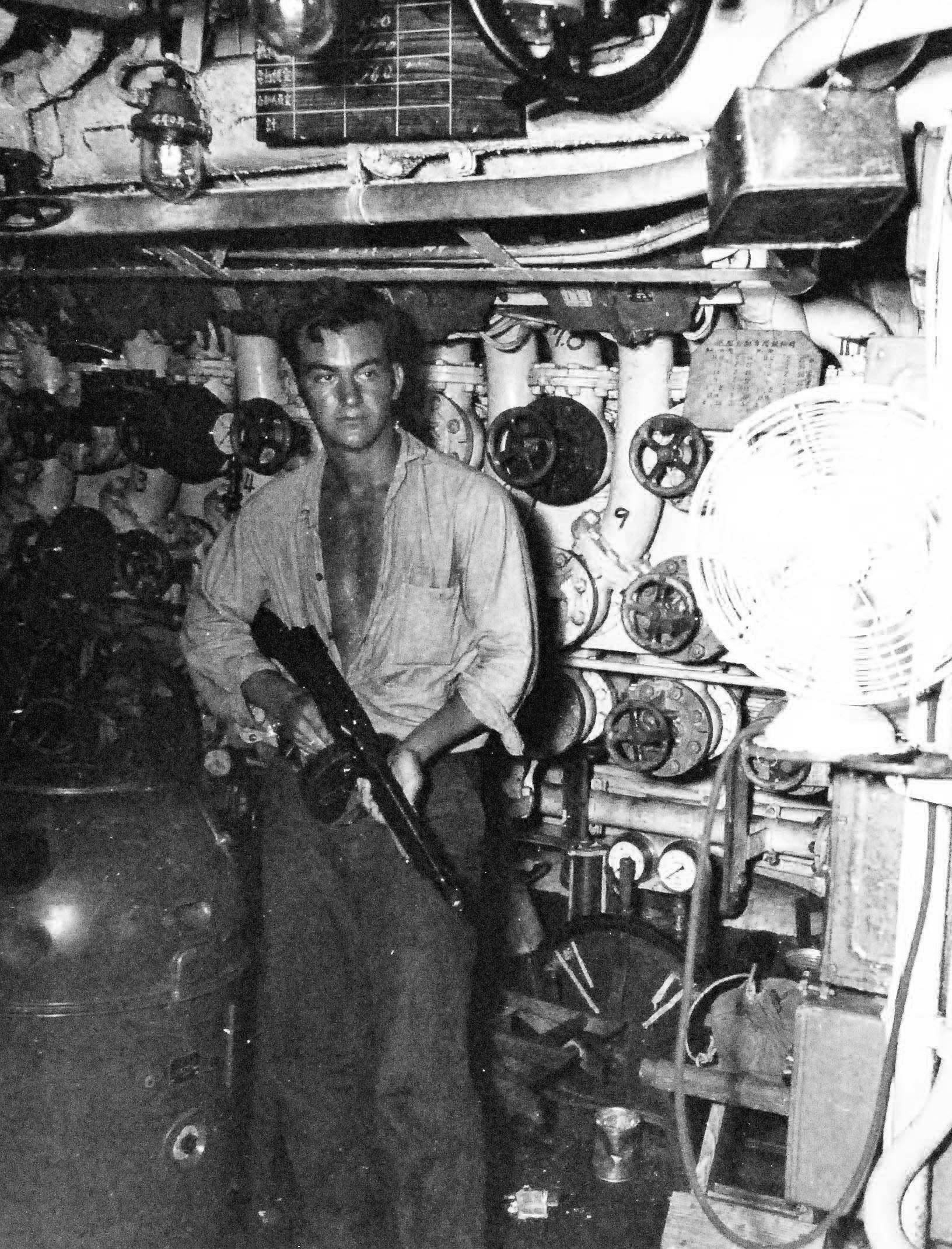 ![]() | 321k | F1/C William Gibson stands guard with tommy gun in control room of surrendered Japanese submarine I-14 after prize crew brought vessel into Sagami Bay, Japan, possibly 29 August 1945. | USN photo # 80-G-349381, courtesy of the Library of Congress, from the National Museum of the U.S. Navy, courtesy of flickr.com. | |