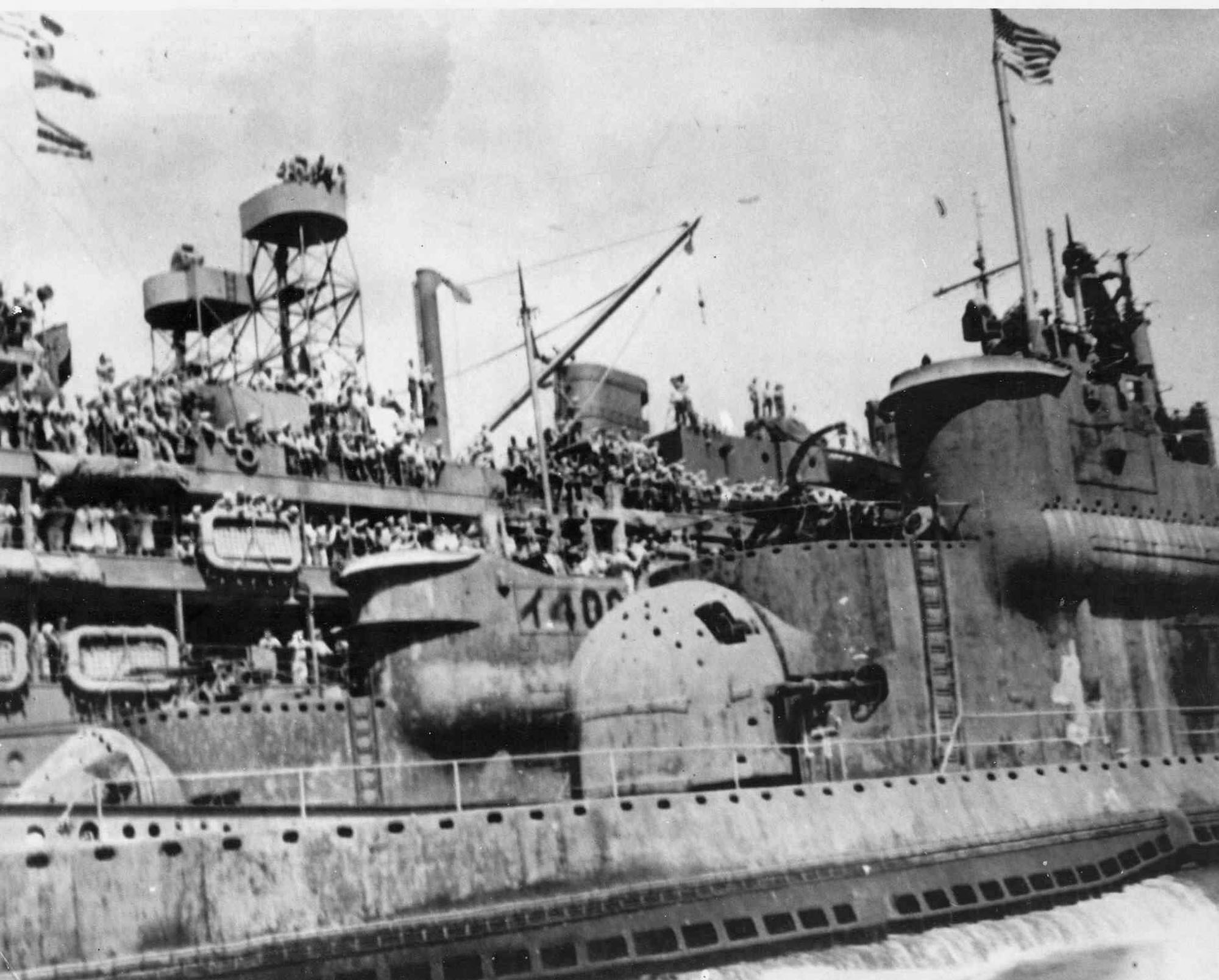 ![]() | 178k | Blower (SS-325) in Tokyo Bay next to captured Japanese submarine I-400, circa September 1945. | USN photo courtesy of usssubvetsofwwii.org. | |