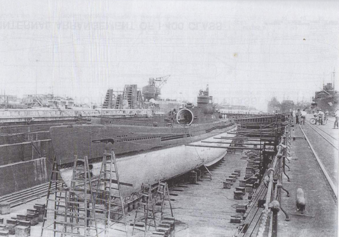 ![]() | 343k | I-400 in Dry dock # 1 Pearl Harbor 1946. | Photo courtesy of John Hummel, (USN) retired. | |